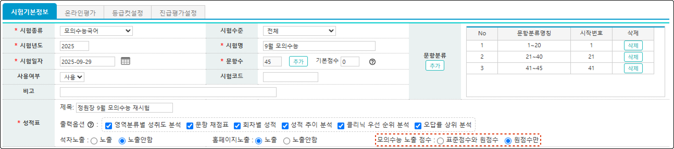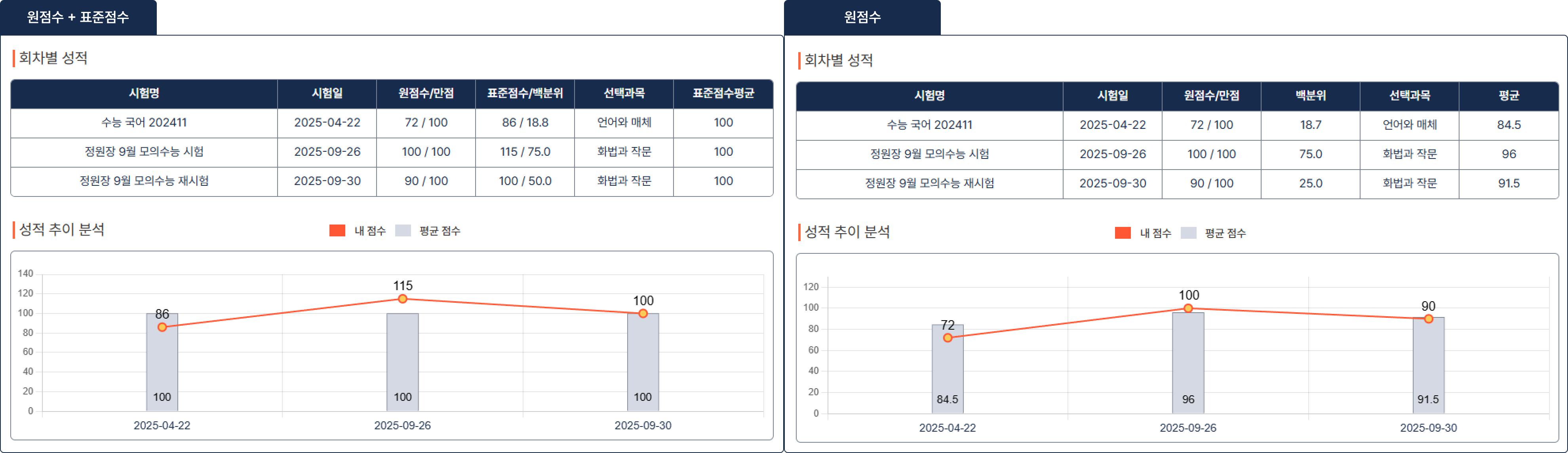 표준점수와 원점수를 모두 노출하거나 원점수만 노출할 수 있어요.