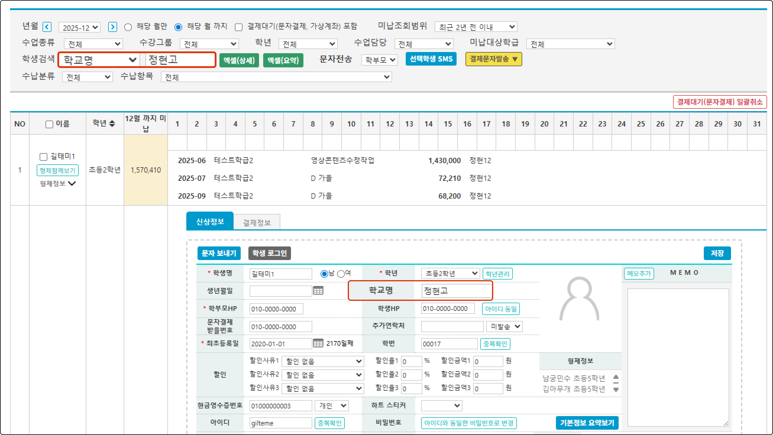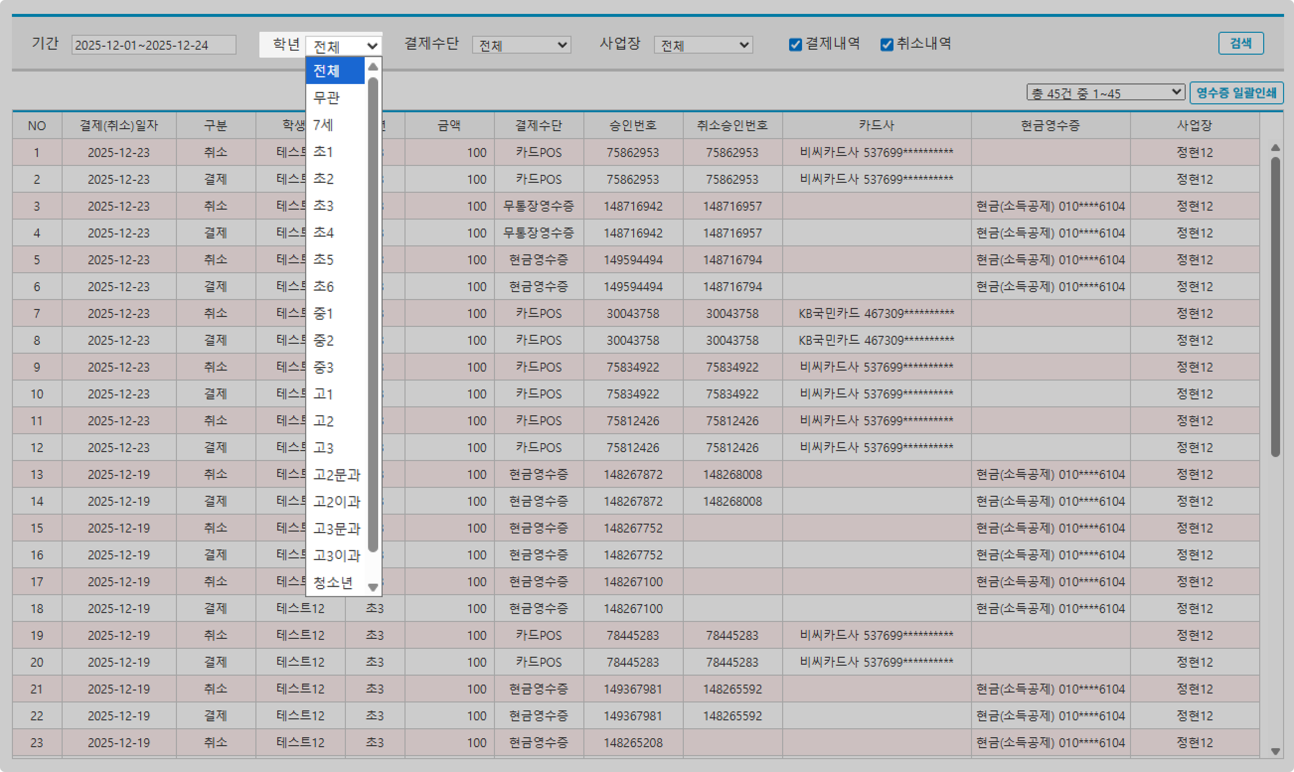 학년 검색 필터를 이용해 학년별 영수증 인쇄가 가능해요.