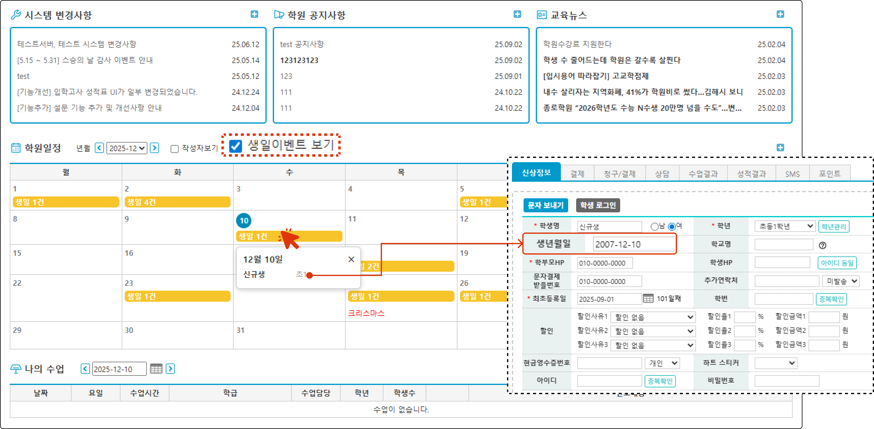 메인(학원일정) → 생일이벤트 보기 체크 → 일자별 생일자 확인