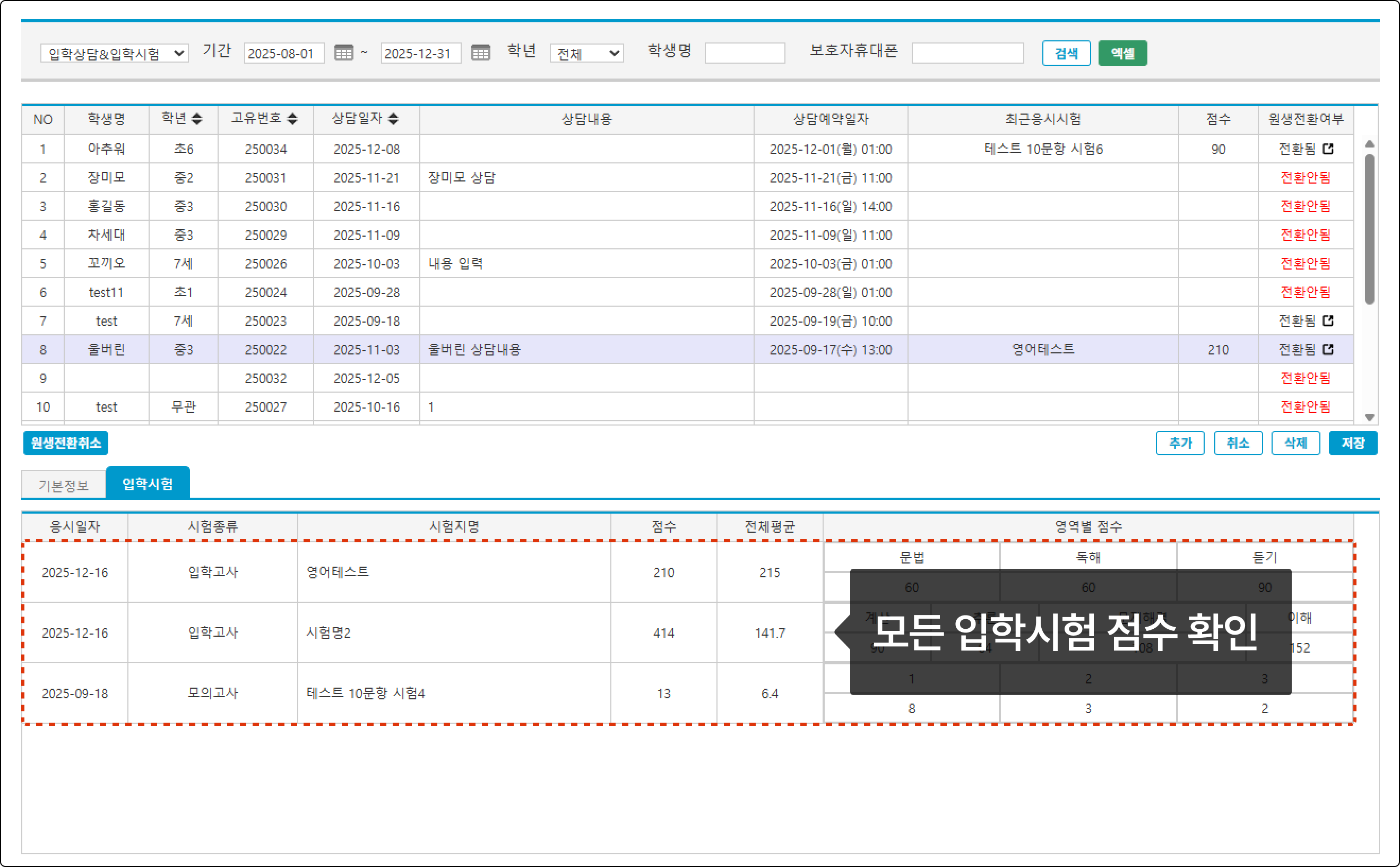 [상담]탭에서 최근 응시한 입학시험 확인이 가능해요.