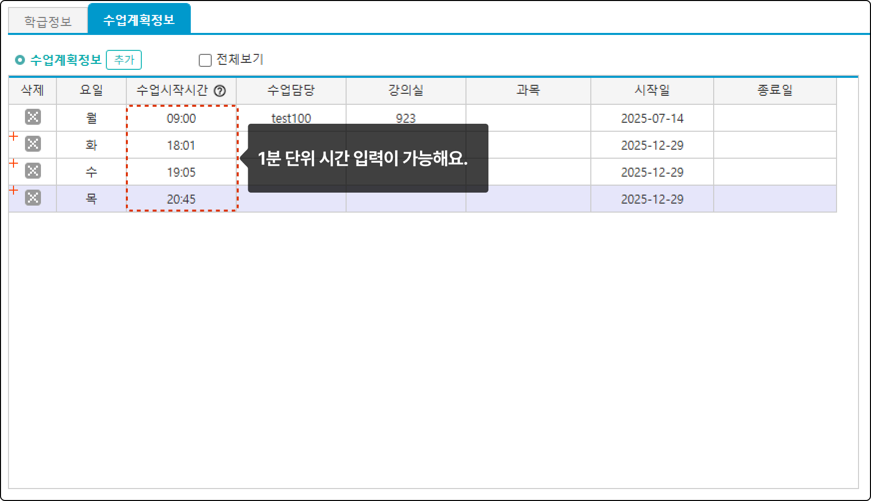수업 시작 시간이 입력 형식으로 변경됐어요.