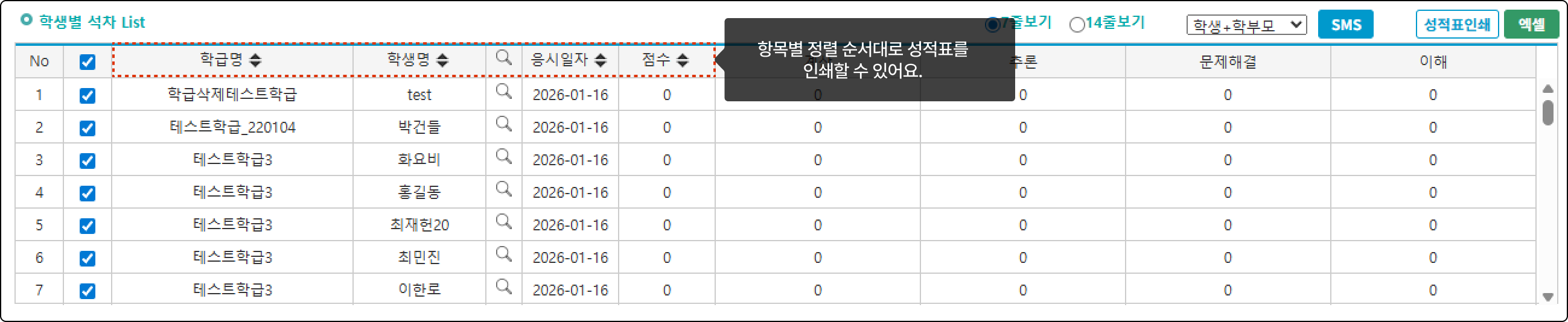 항목별 정렬 순서를 변경하고 순서대로 성적표를 인쇄할 수 있어요.
