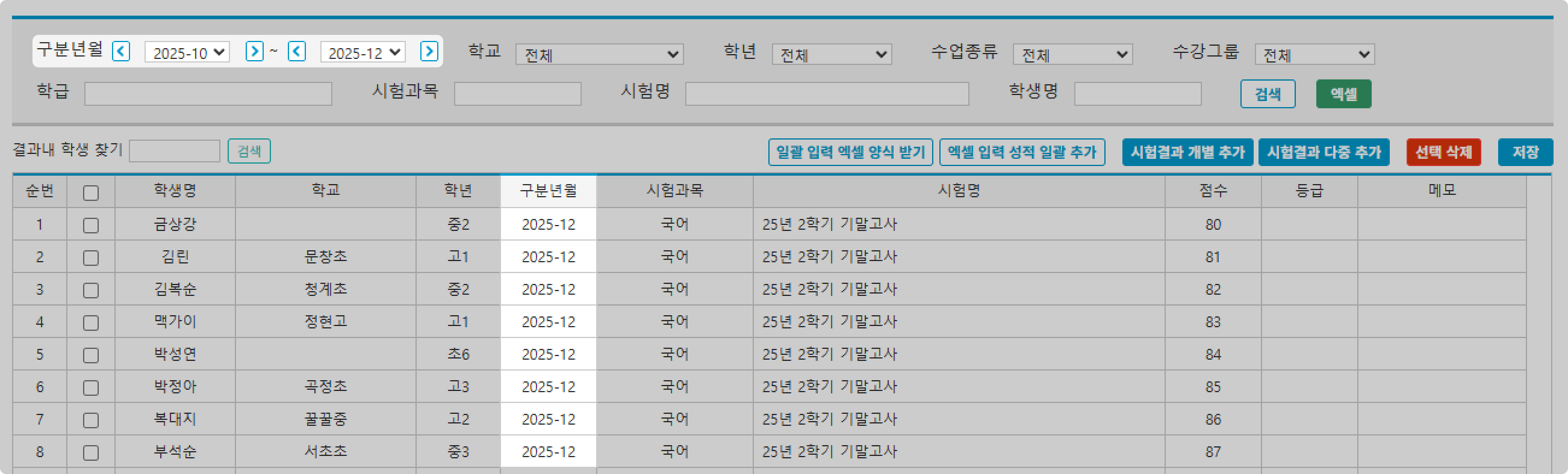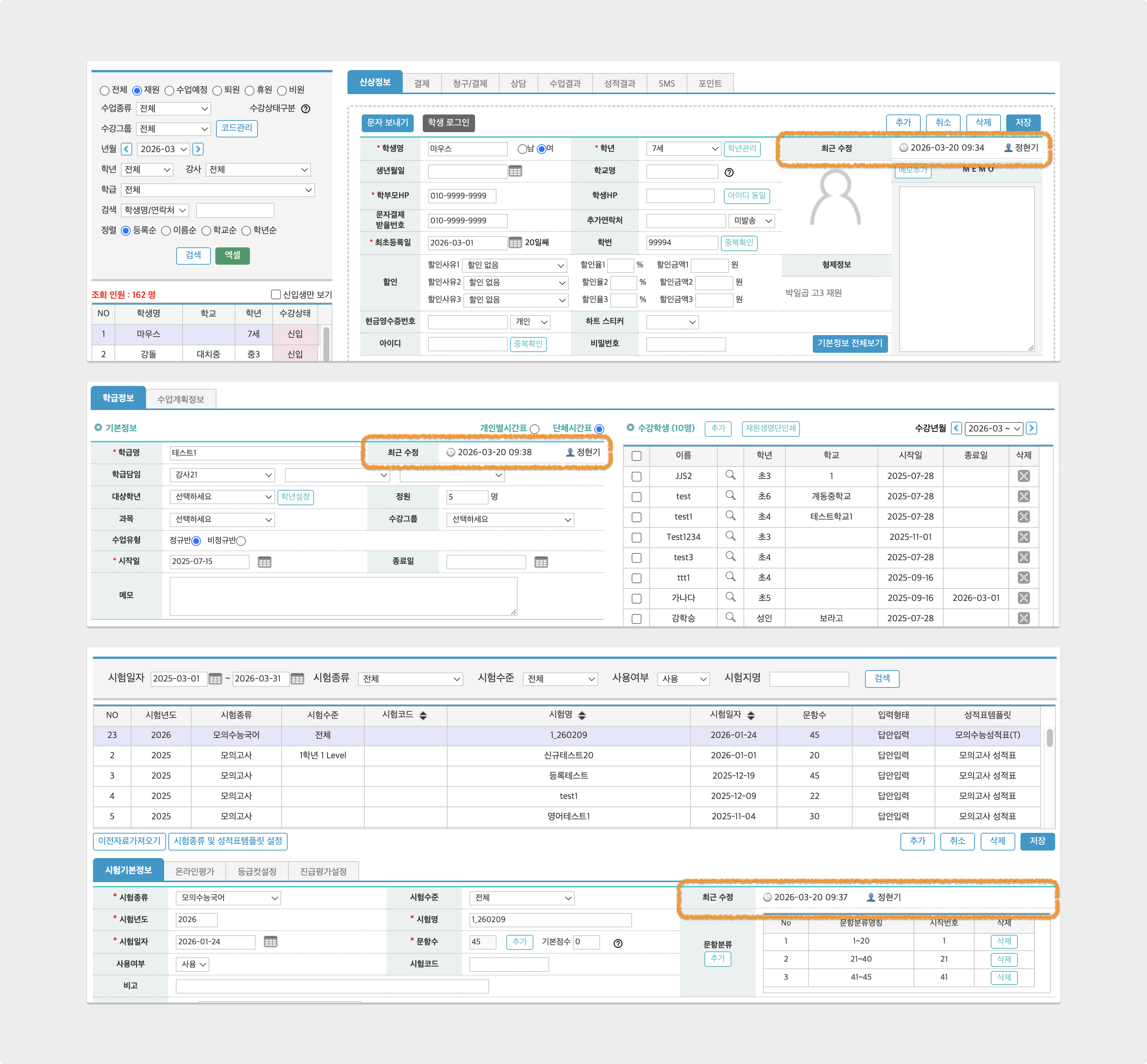 [학생관리], [학급관리] 그리고 [시험관리] 메뉴에 최근 정보를 확인할 수 있는 영역이 추가되었어요.