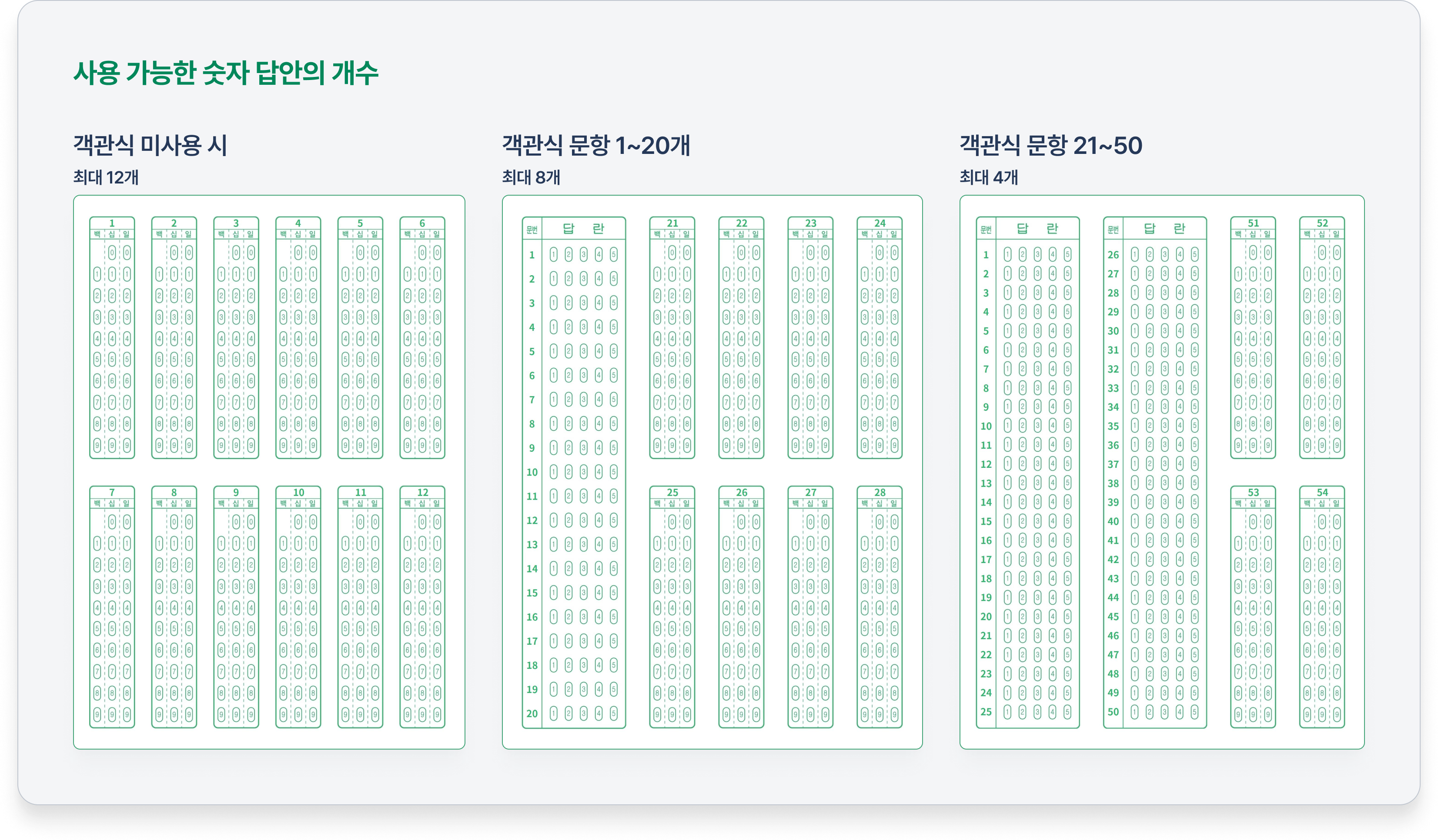 설정한 객관식 문항 수에 따라 사용 가능한 숫자 답안의 개수가 달라집니다.