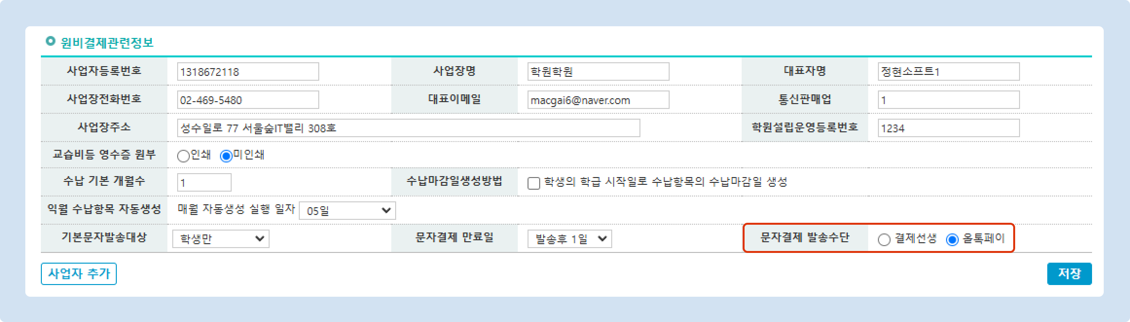 [관리메뉴] → [학원정보/학원정보관리] 메뉴로 이동합니다. 왼쪽 하단에 위치한 [사업자 추가] 버튼을 눌러 결제 사업자 관리 팝업을 엽니다.