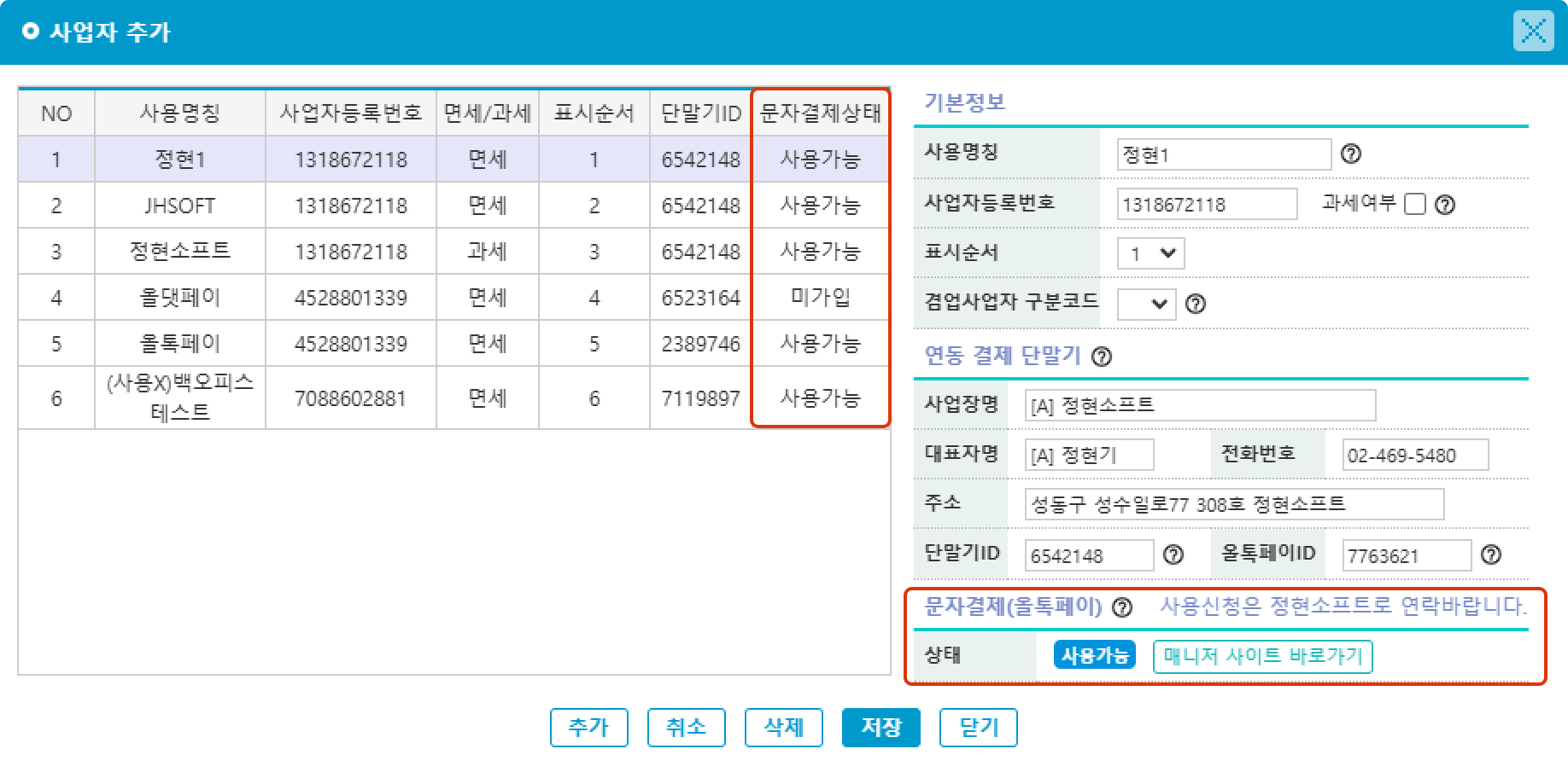 올톡페이을 사용할 수 있는 상태라면 문자결제상태 열의 버튼이 '사용가능'으로 표시됩니다.