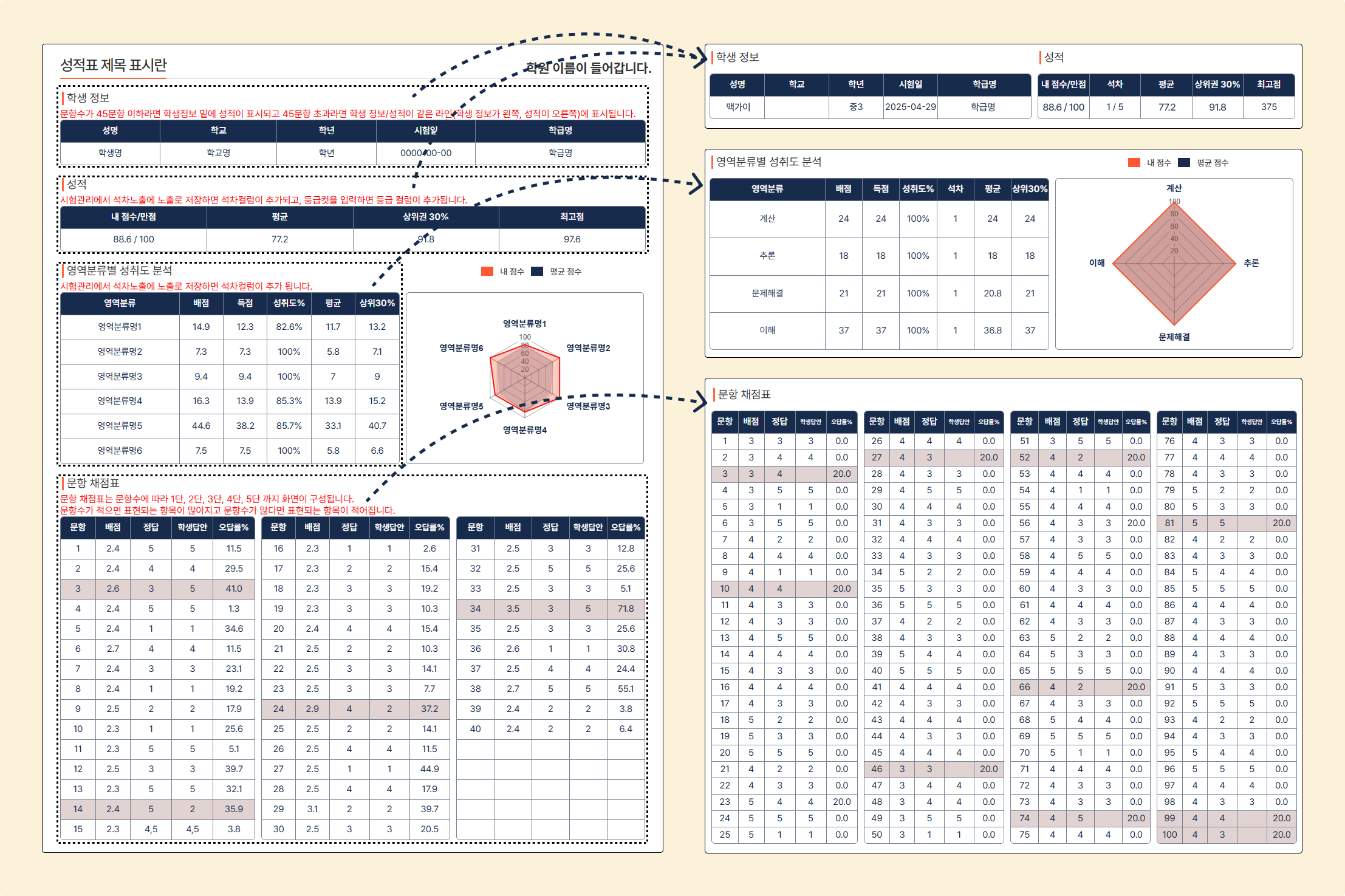 문항 수, 석차 노출, 등급컷 등 정보에 따라 변경되는 정보들은 가이드 문서를 참고해 주세요.