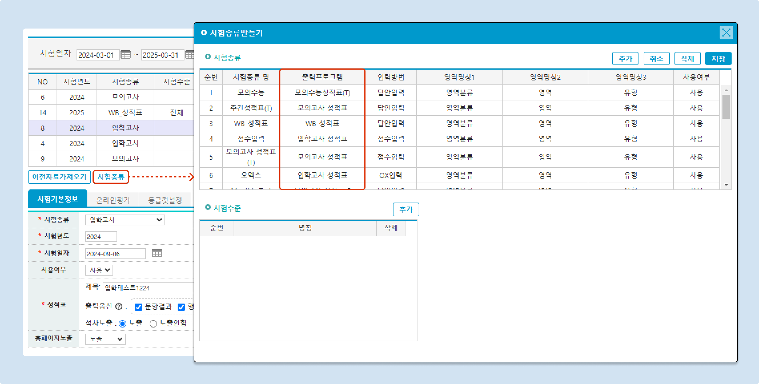 [시험종류] 버튼을 눌러 시험 종류 설정이 가능합니다.