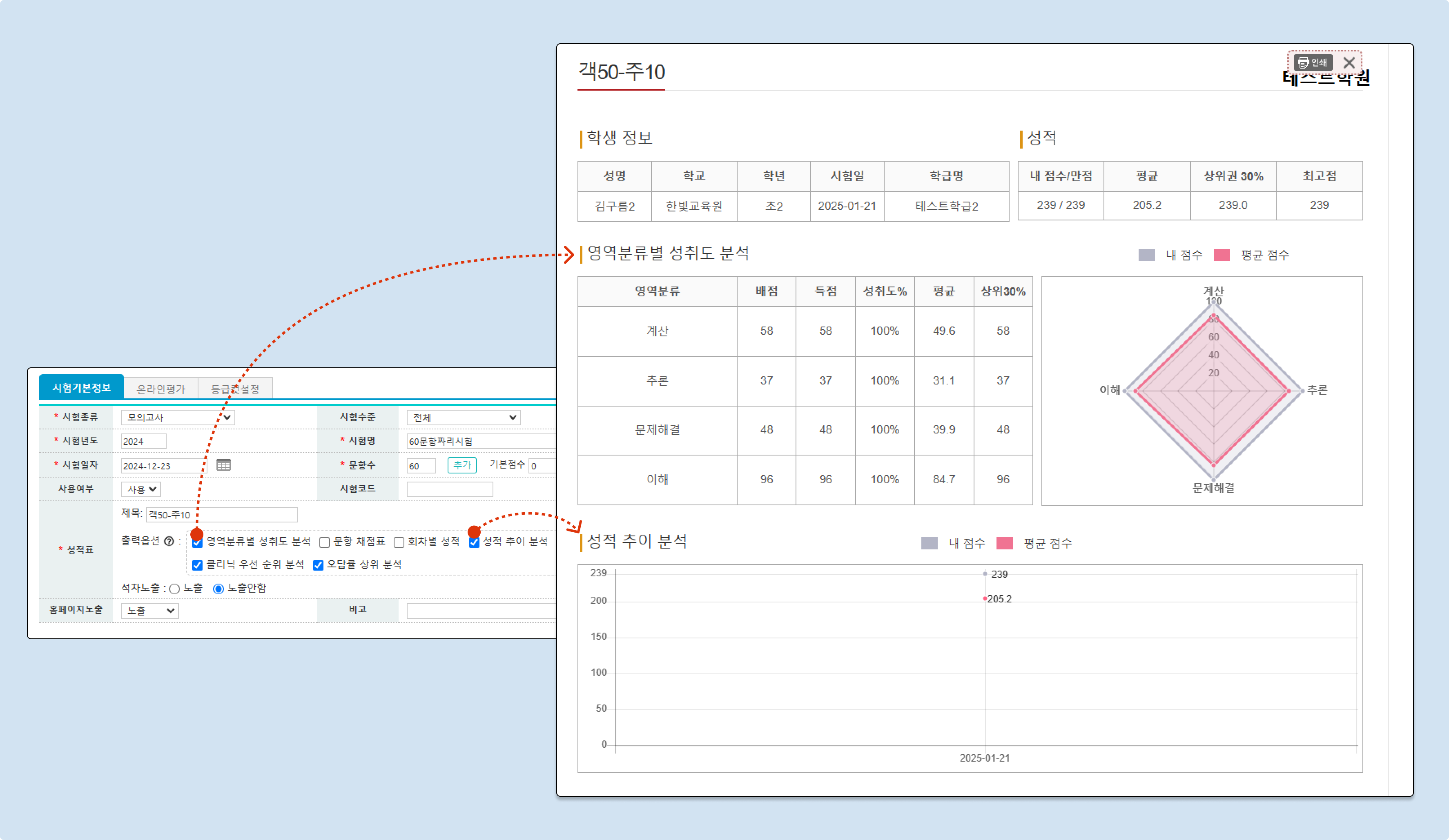 시험의 성적표(출력형태)별 선택 옵션을 확인해 주세요.