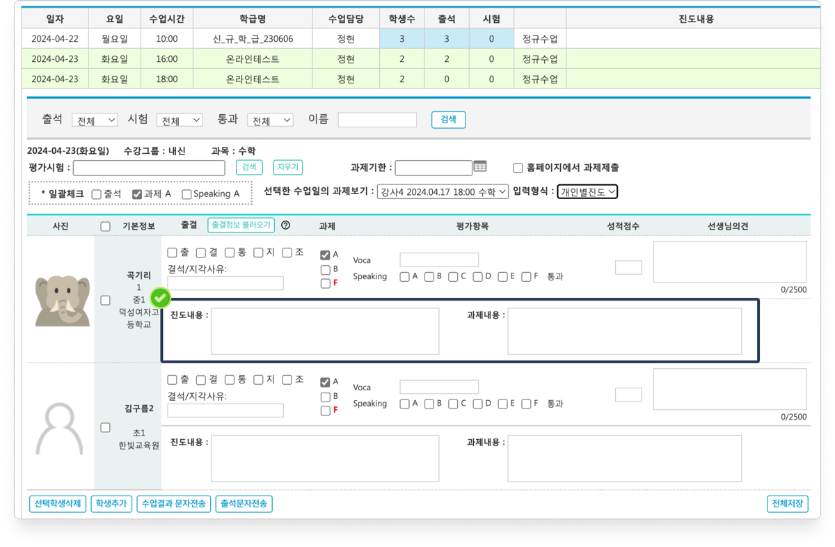 이러한 문제를 해결하고, 개인별 진도를 운영하는 학원들의 요구를 반영하고자 개인별 진도 및 과제를 입력할 수 있는 기능을 추가했어요.