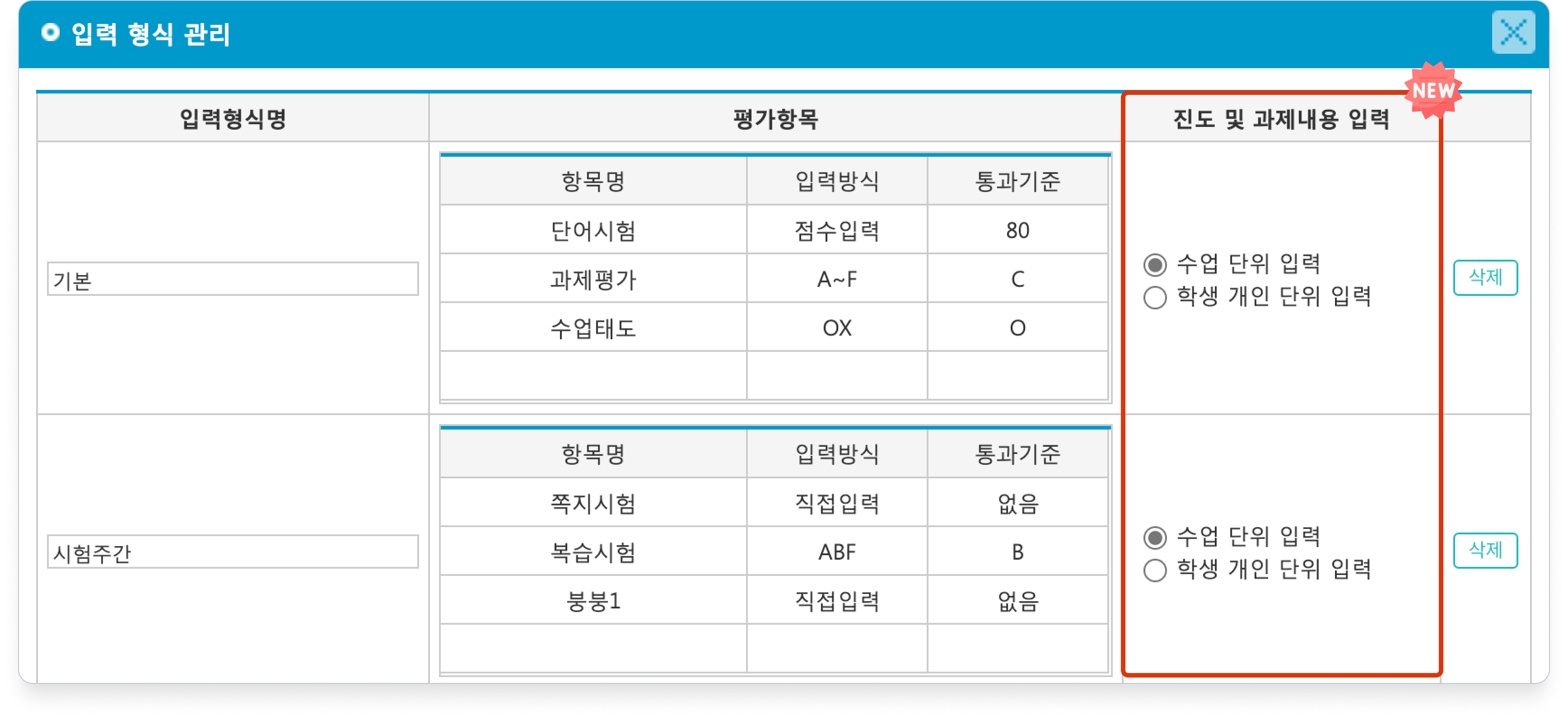 진도 및 과제 입력 방식을 선택할 수 있게 변경되면서 수업 목록 메뉴의 입력형식 관리에 새로운 항목이 추가되고 레이아웃이 조정되었습니다.