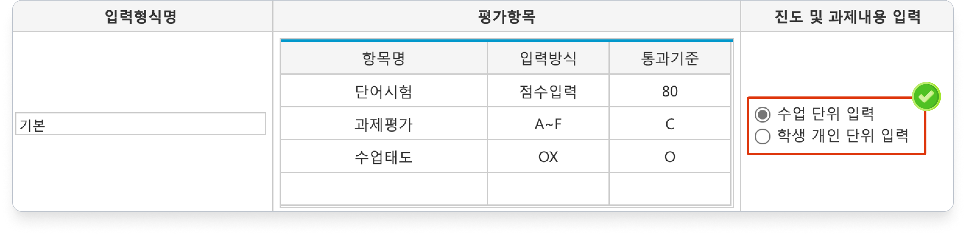 입력 형식은 학급 또는 수업에 귀속되지 않아 수업 결과를 좀 더 유연하게 입력할 수 있는 장점이 있어요.