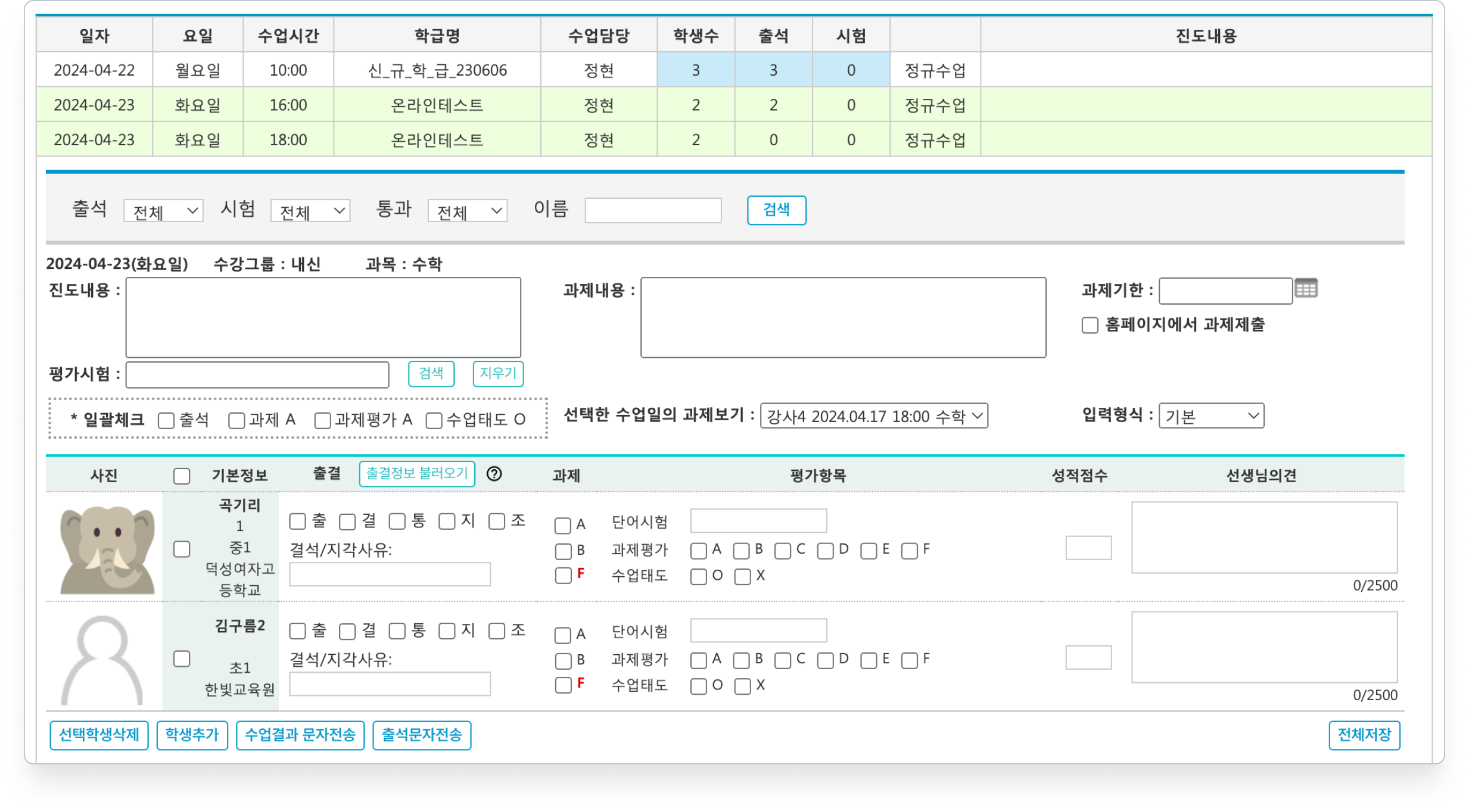 학생 개인단위 입력: 같은 수업 내에서 개별 학생의 진도와 과제를 기록하고 관리할 수 있어요.