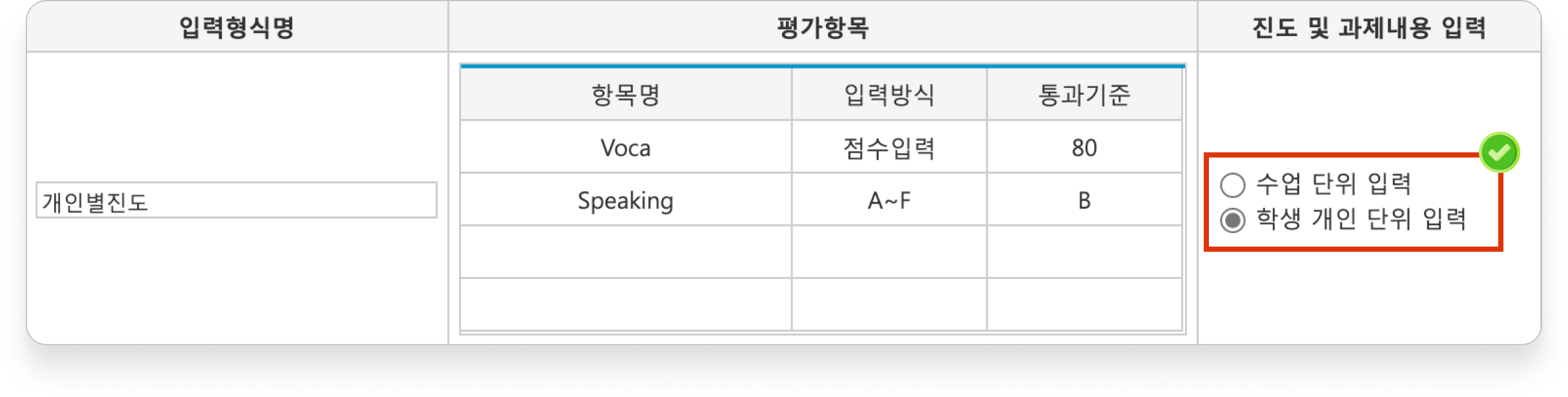개인별 진도를 운영하는 학원에 적합한 입력 방식이에요.