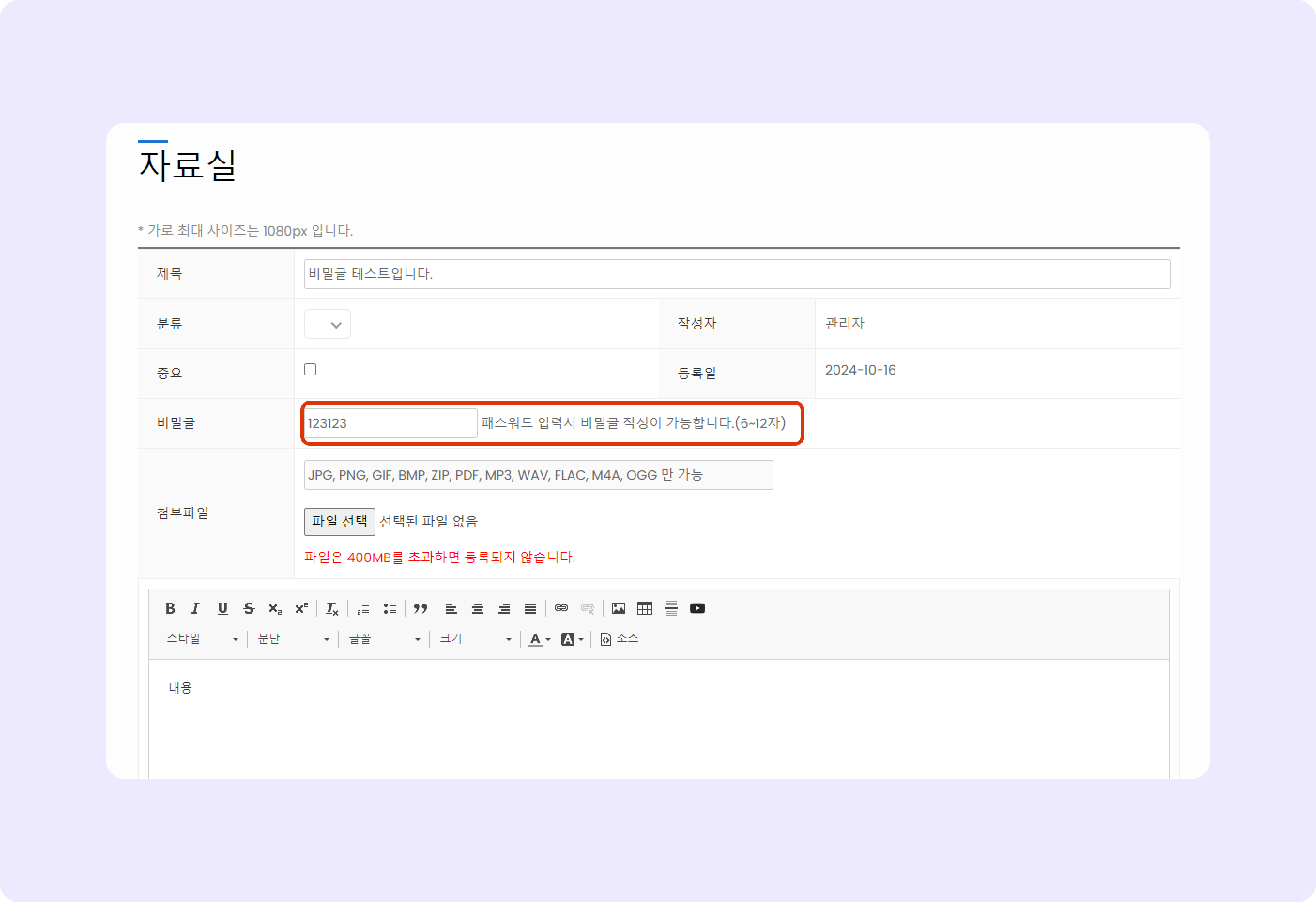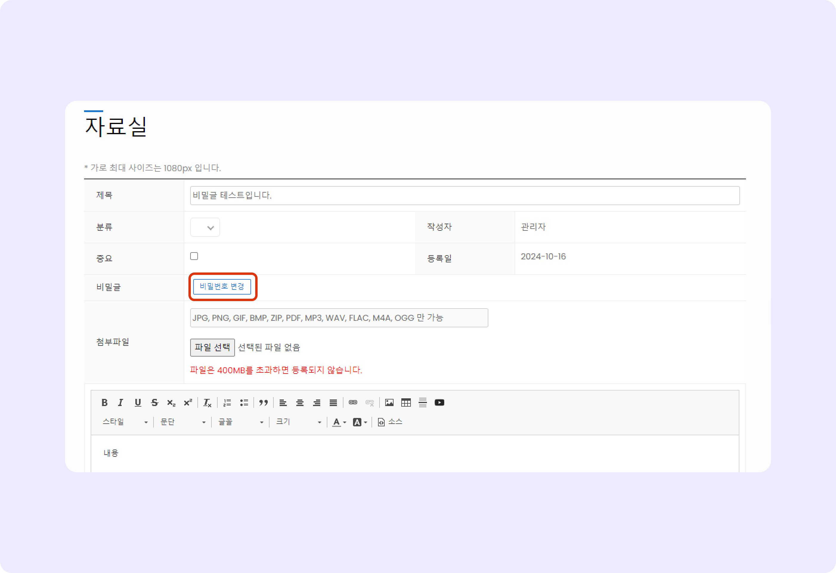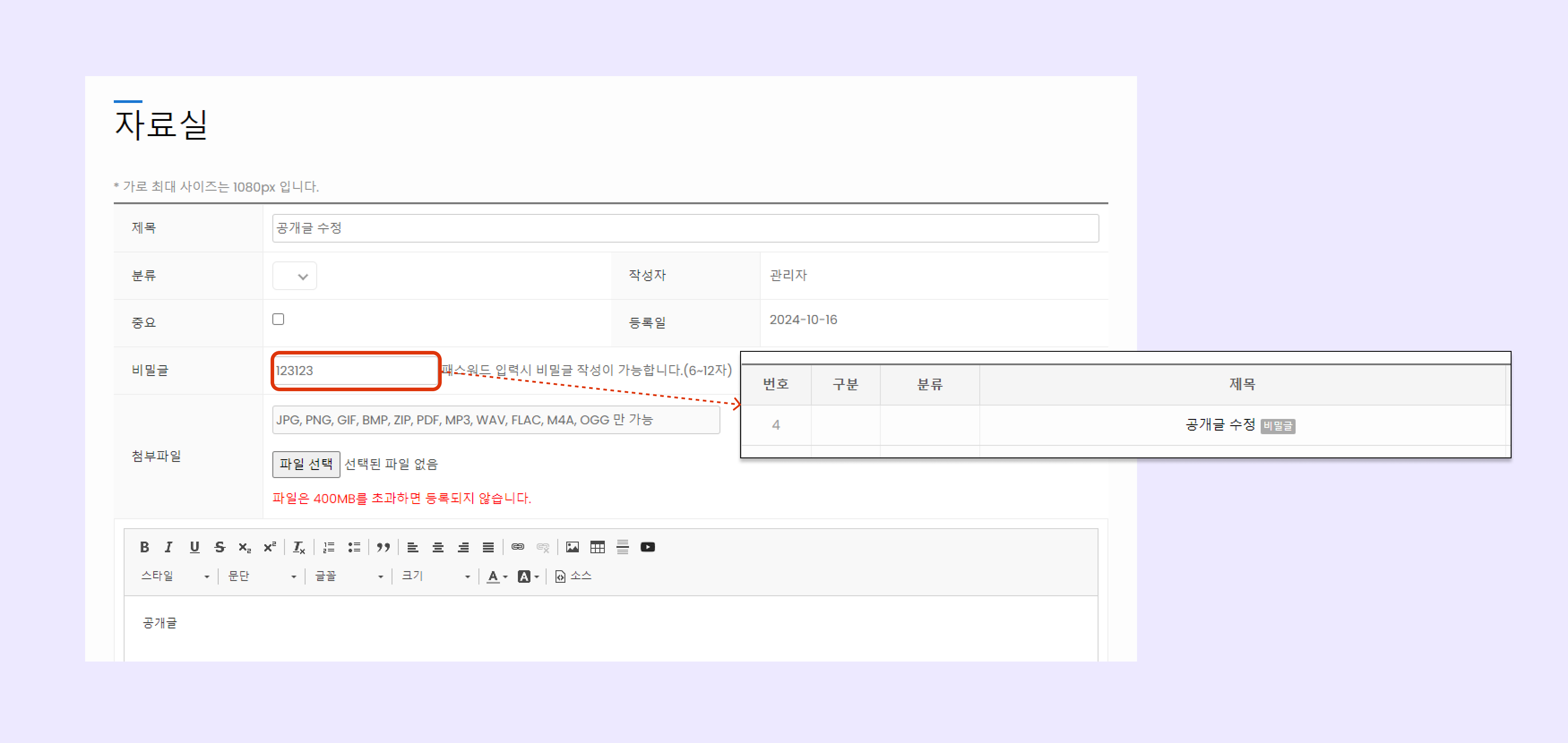 비밀번호를 추가하면 비밀글로 수정됩니다.