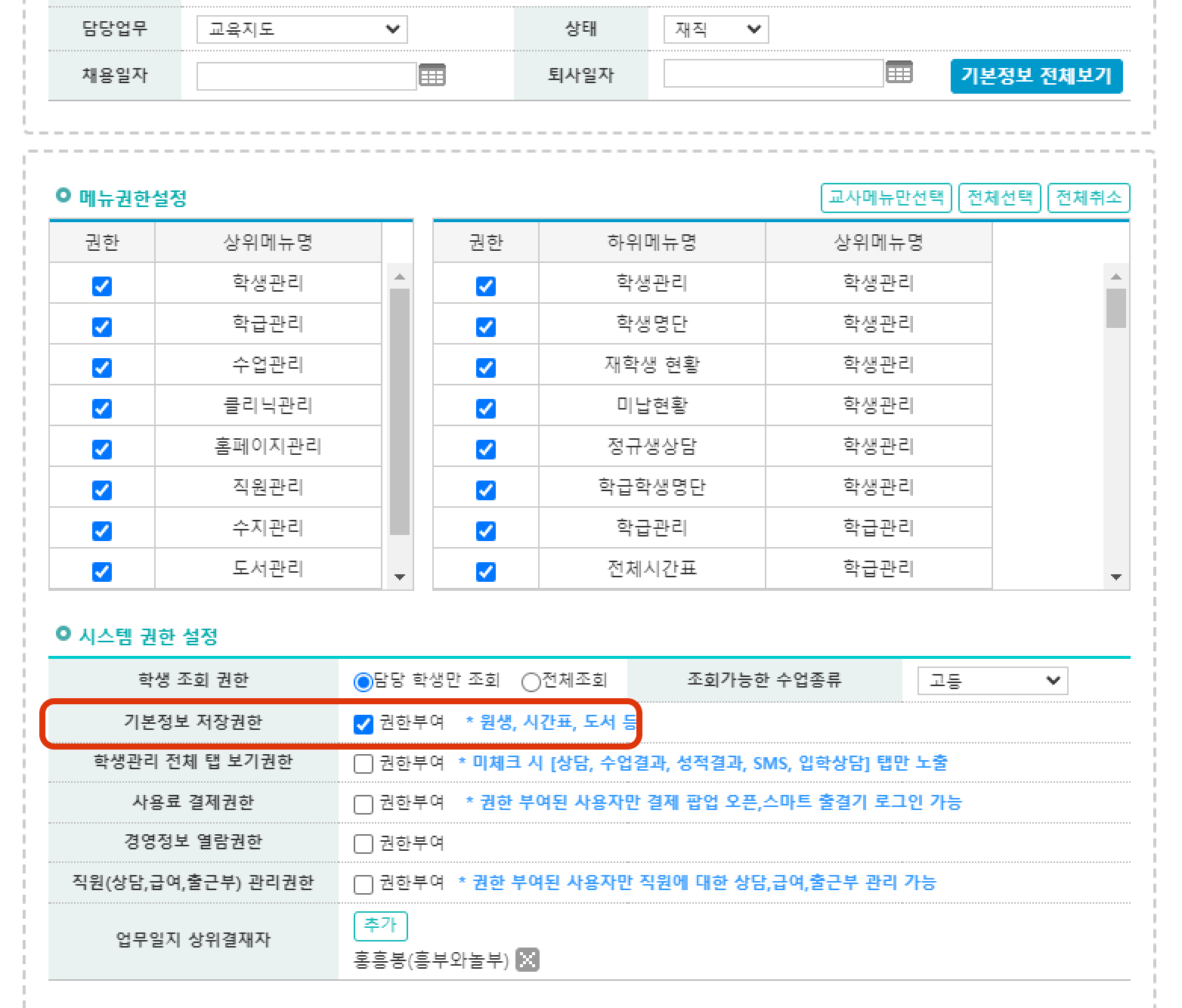 직원: 기본정보 저장권한에 따라 조건이 달라집니다.접근 경로:직원목록→직원신상→기본정보 저장권한