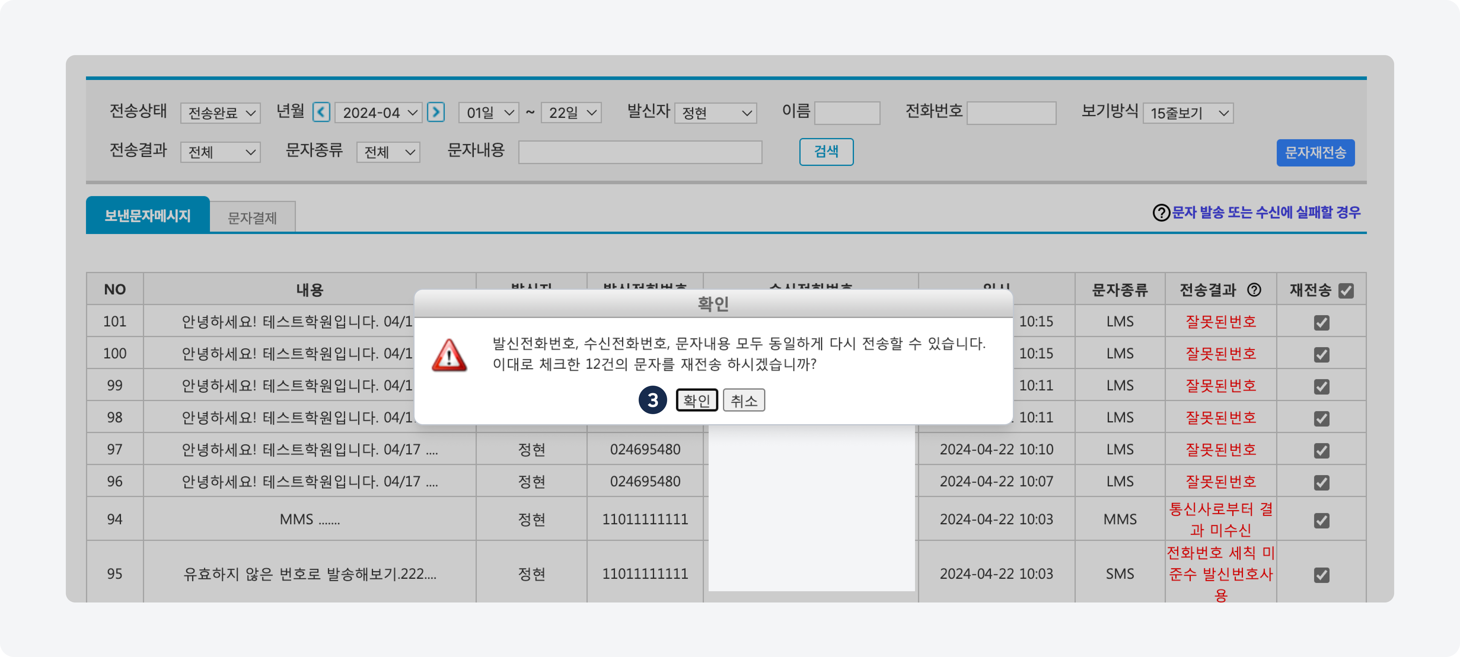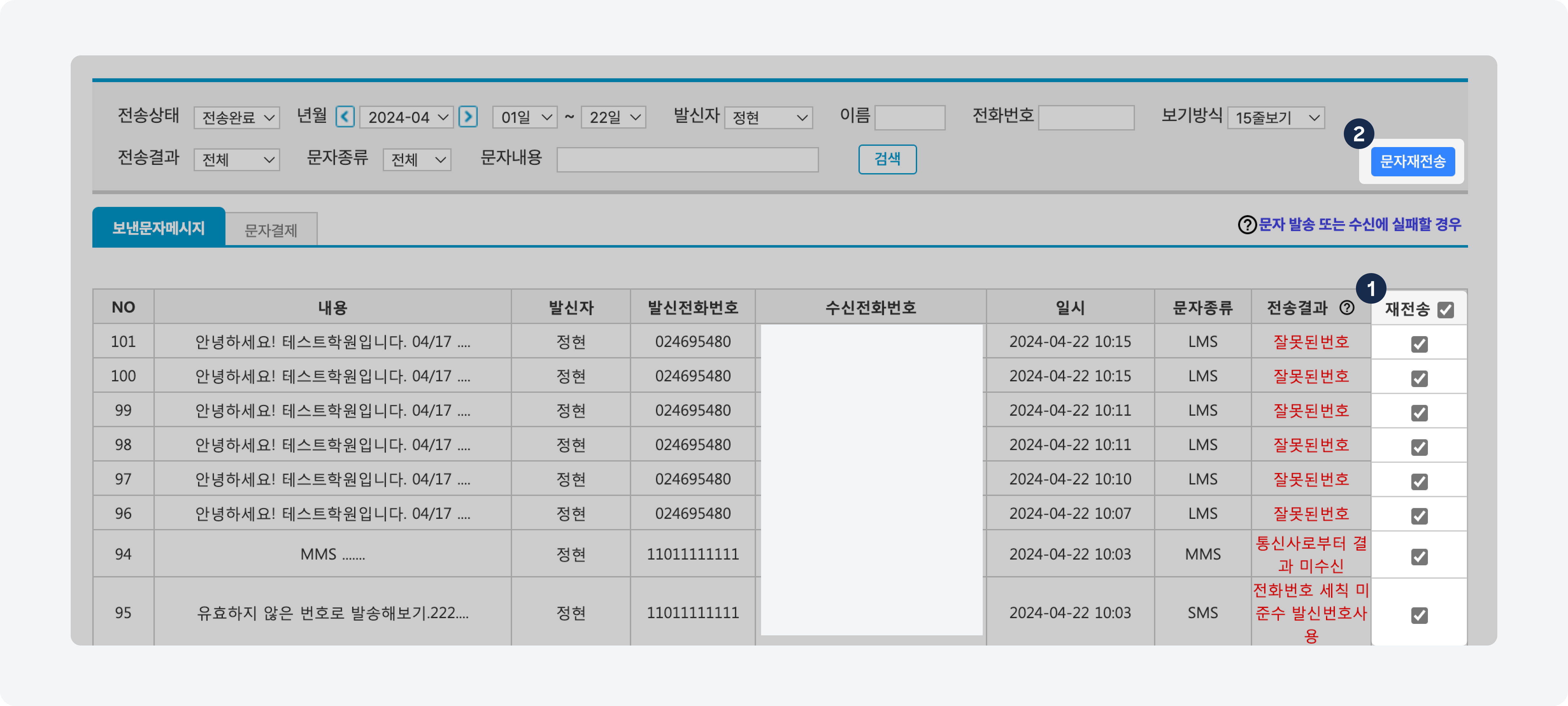 발송 성공 또는 실패한 문자를 선택해 동일한 내용/번호로 재발송 할 수 있습니다