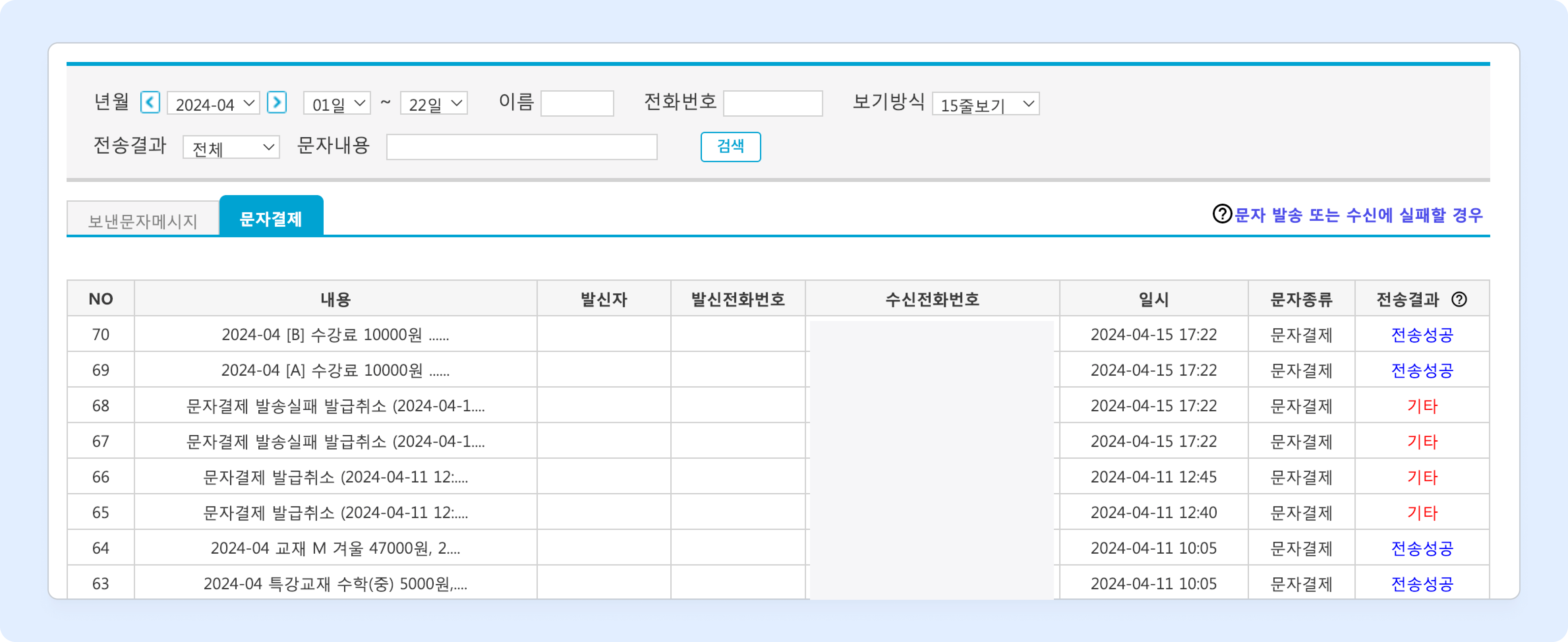 검색 조건 아래의 '문자결제' 탭을 눌러 문자 결제 발송 내역만 모아볼 수 있어요.