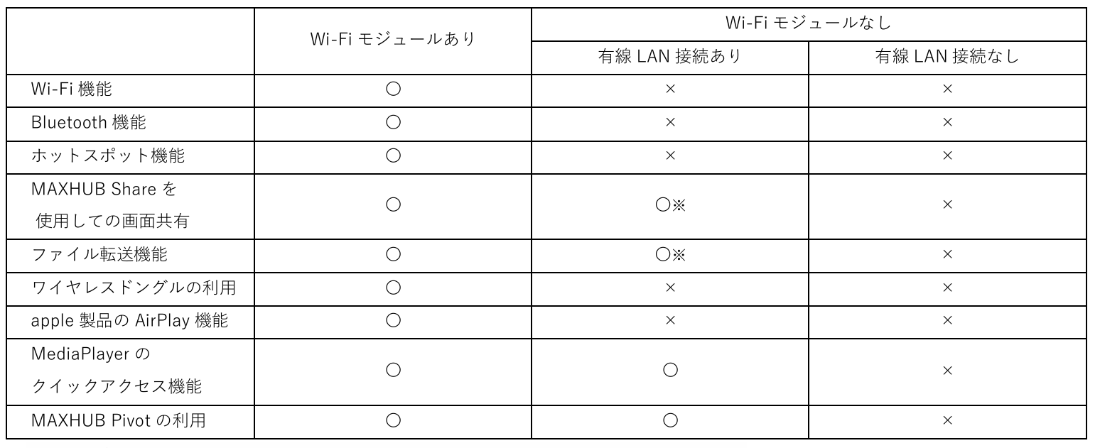 サイネージをご購入の場合はWi-Fiモジュールはオプションです。Wi-Fiの有無や有線LAN接続の有無によって使用できる機能が異なります。 以下の表をご確認ください。
