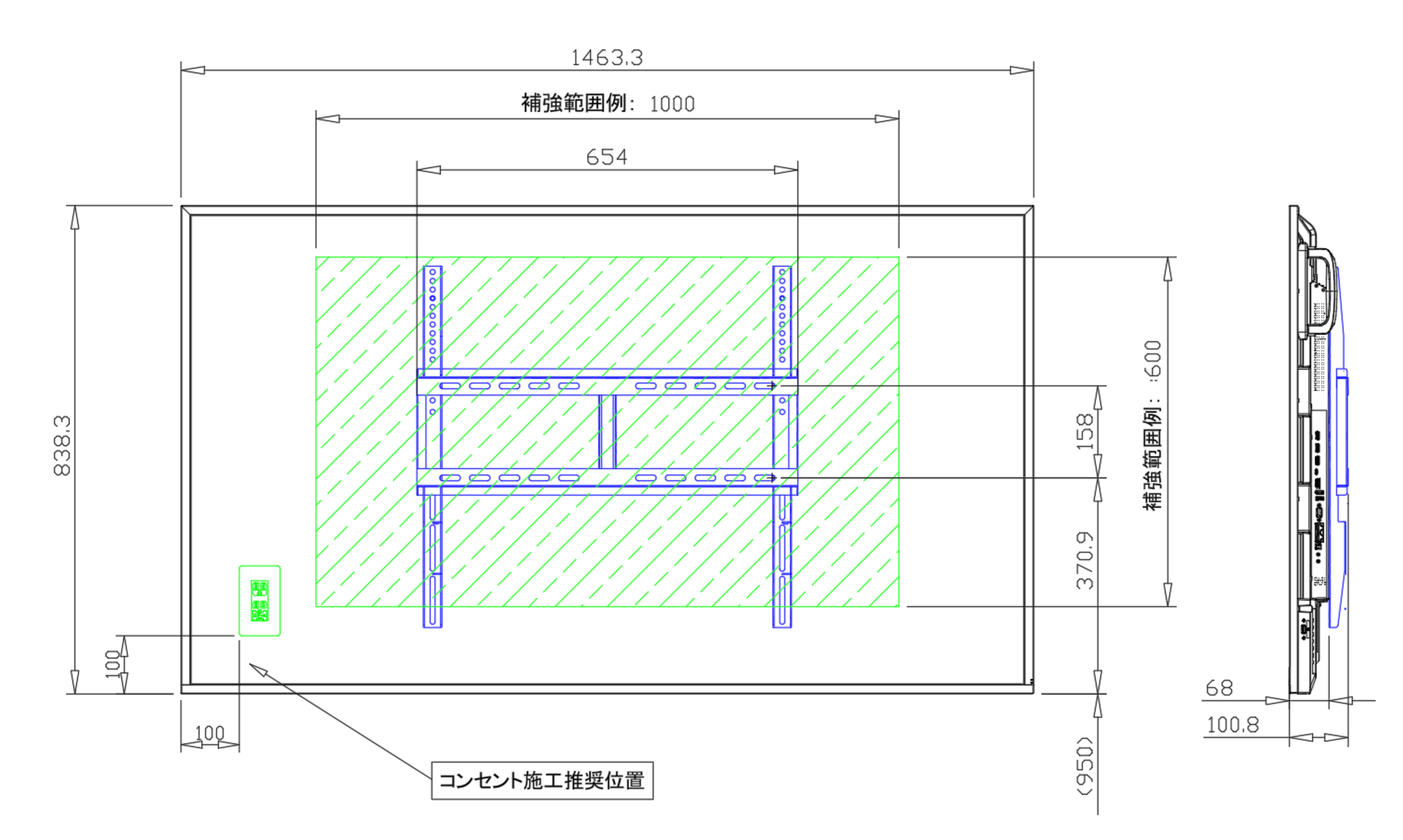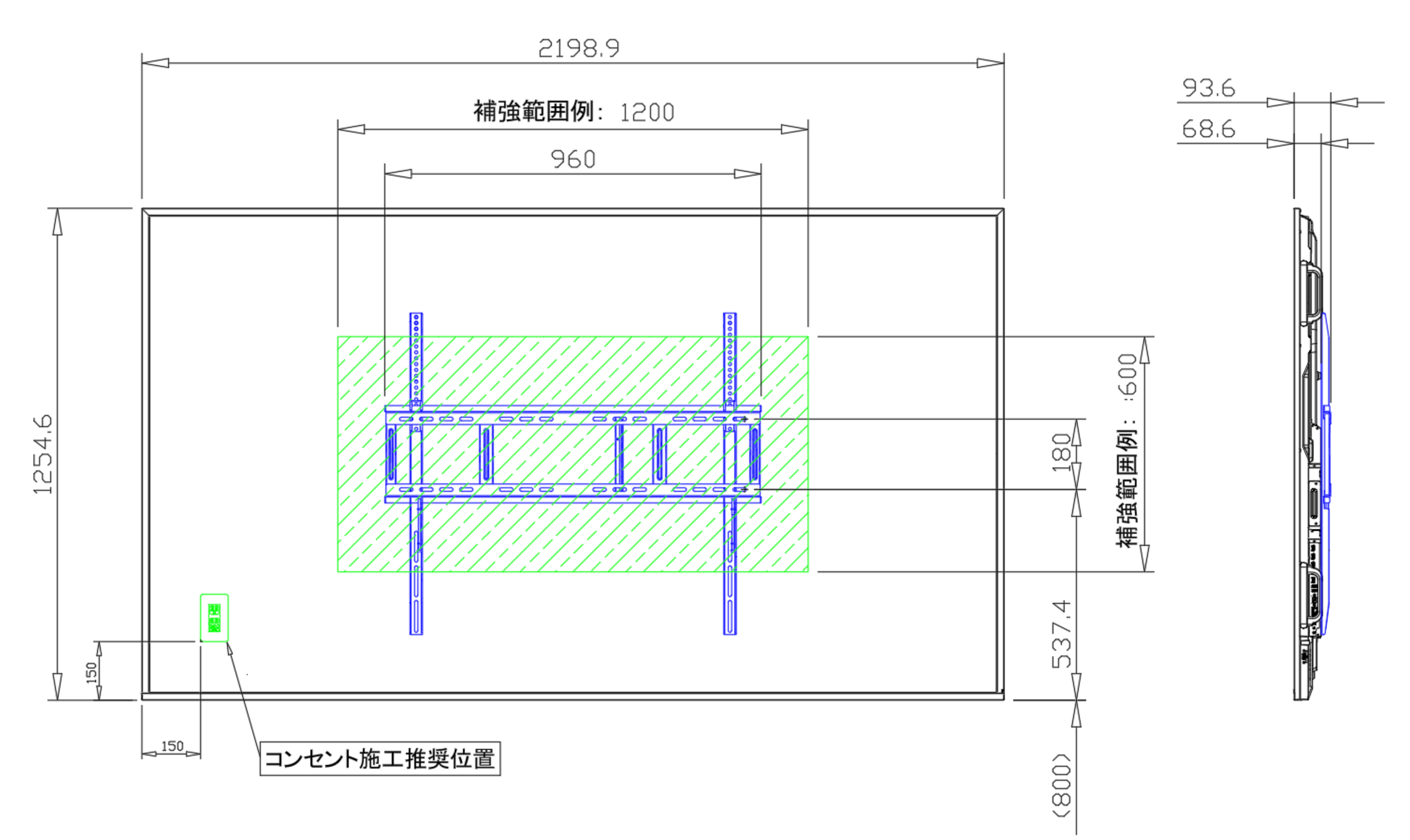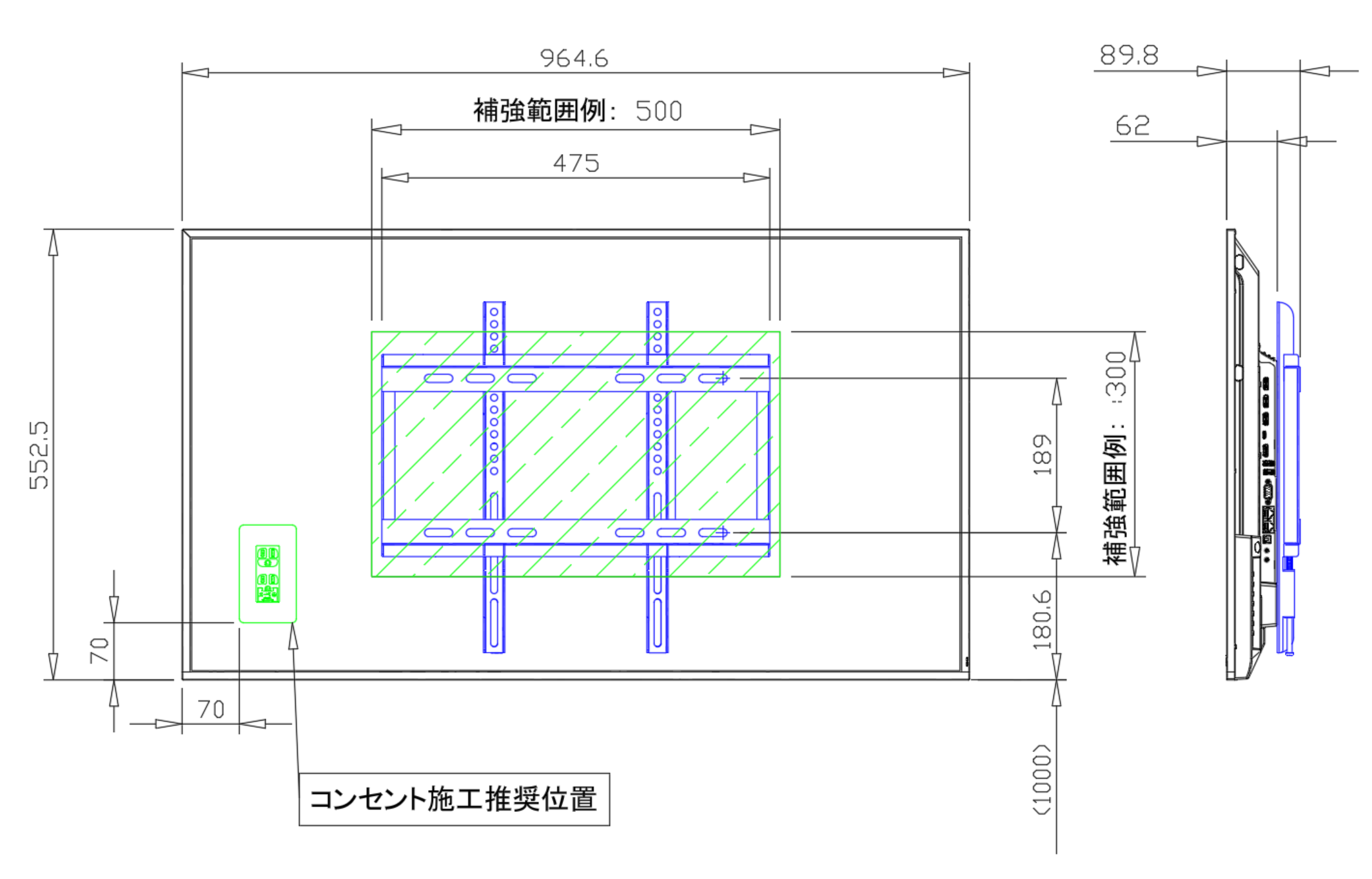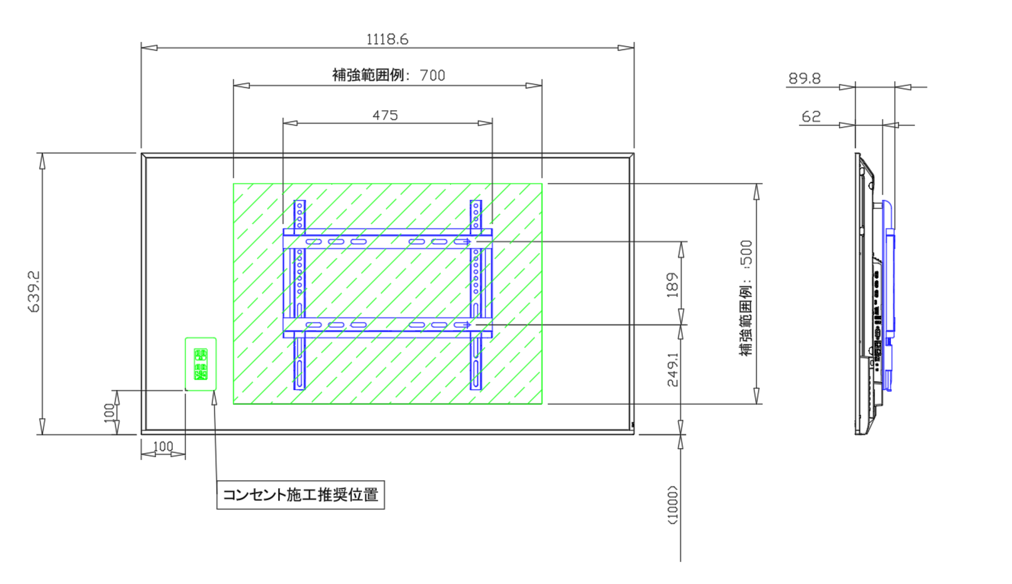本機と壁掛け金具の重量に耐えられる下地・補強をお客様にてご検討ください。