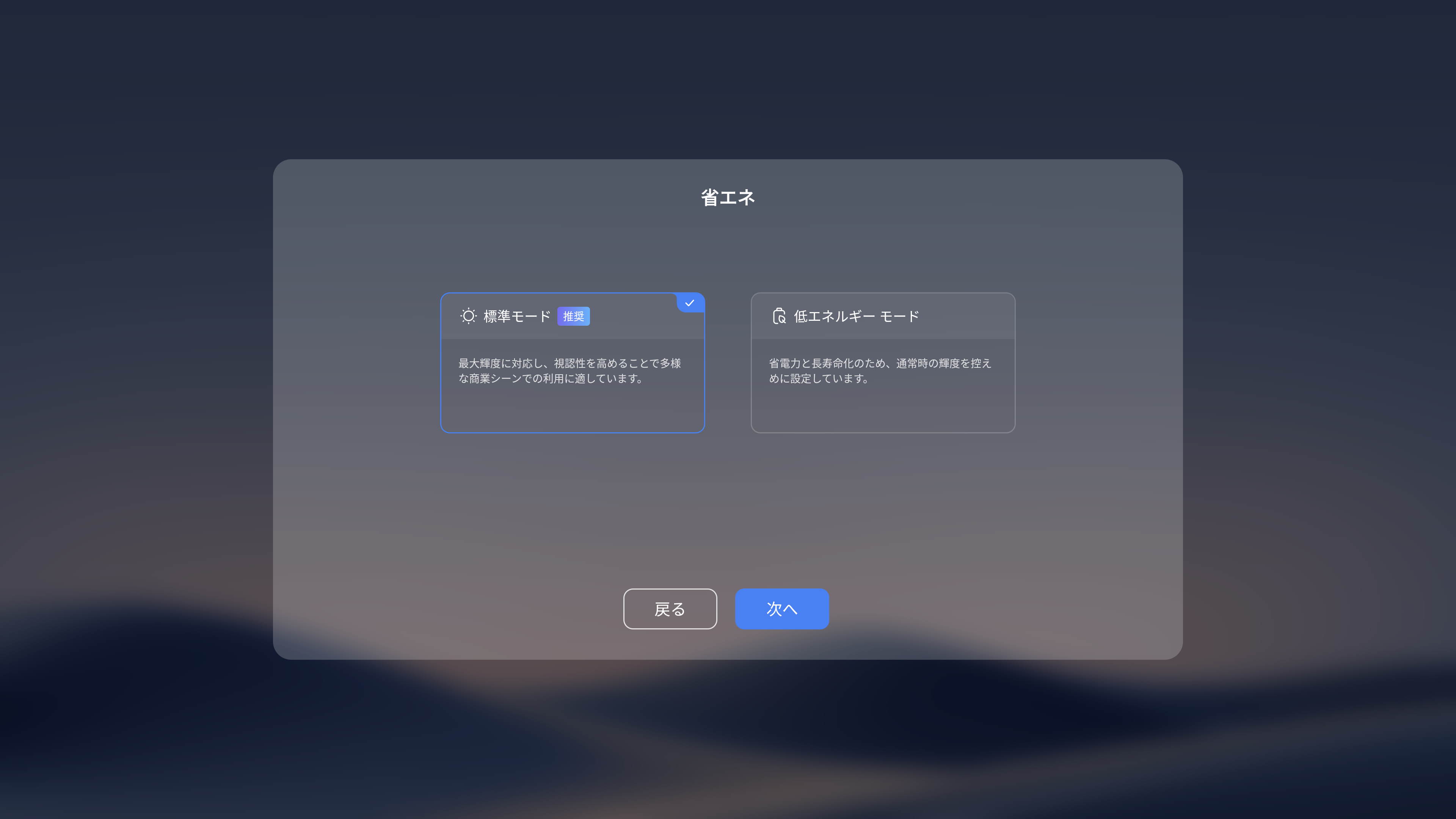 使用方法に応じて使用モードを選択してください。モードを選択することで画面オフまでの時間やシャットダウンに関する設定が推奨値に設定されます。