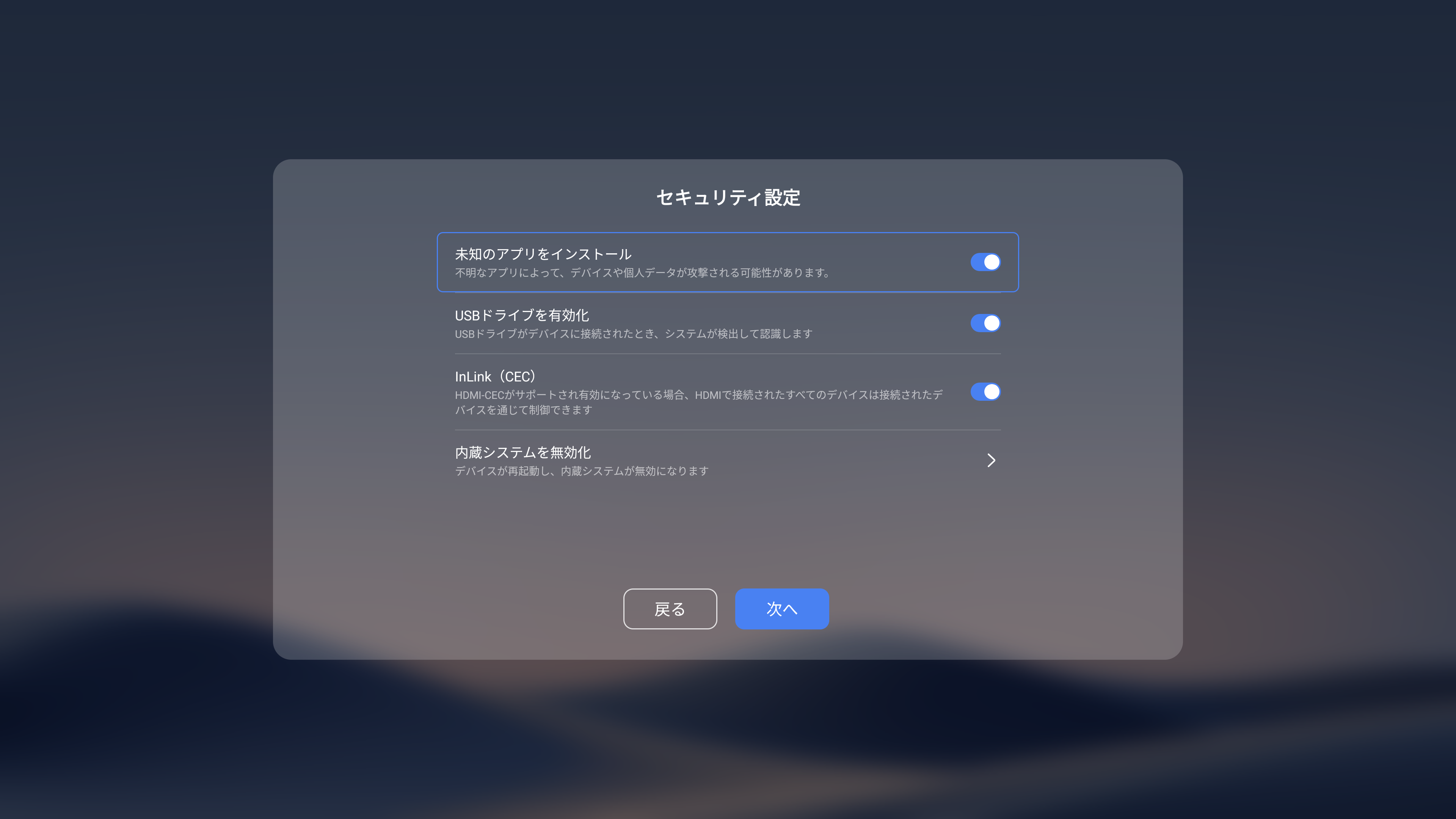 注意:「内部システムを無効化」を選択するとネットワーク機能やワイヤレス投影機能などがすべて無効となります。有線映像入力のみの動作となりますので設定を行う際はご理解の上設定してください。