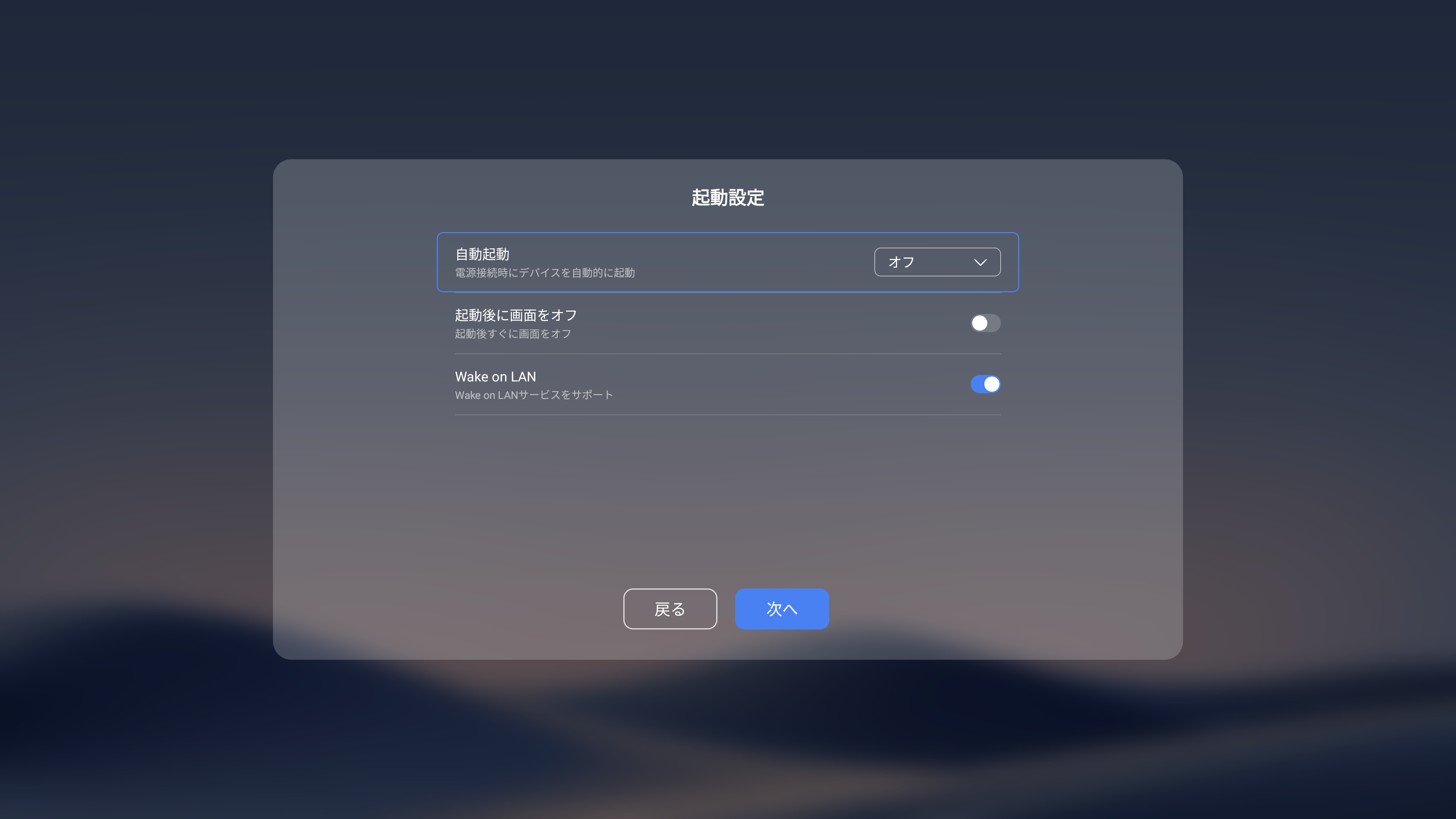 起動時に画面をオフ:起動後の画面表示をオフにして消費電力を節減します。