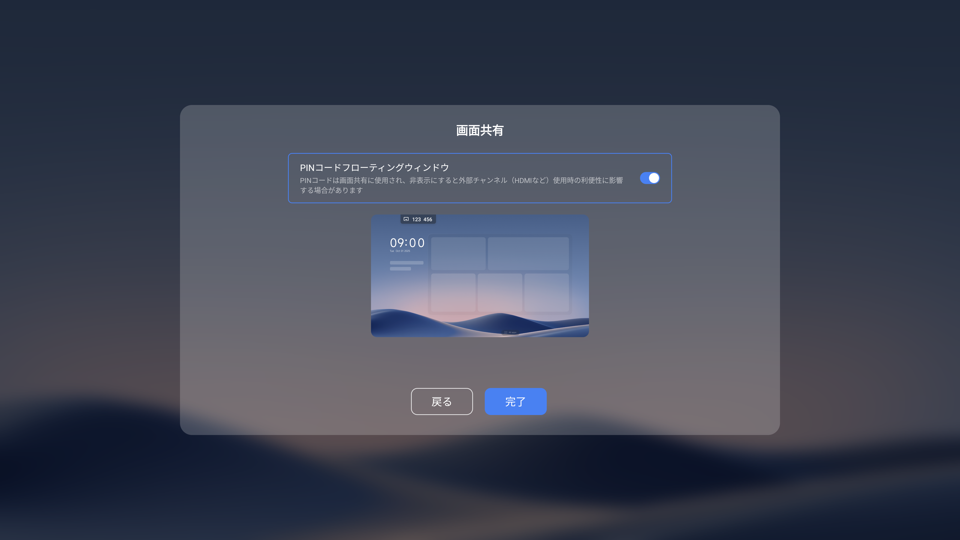 画面上部に表示されるワイヤレス投影用のPINコードの表示を設定します。