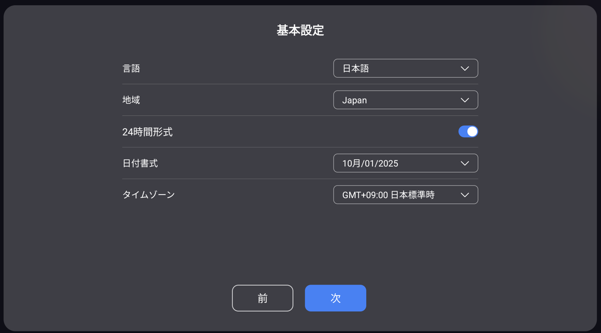 基本設定で言語、地域、タイムゾーン等を設定してください。