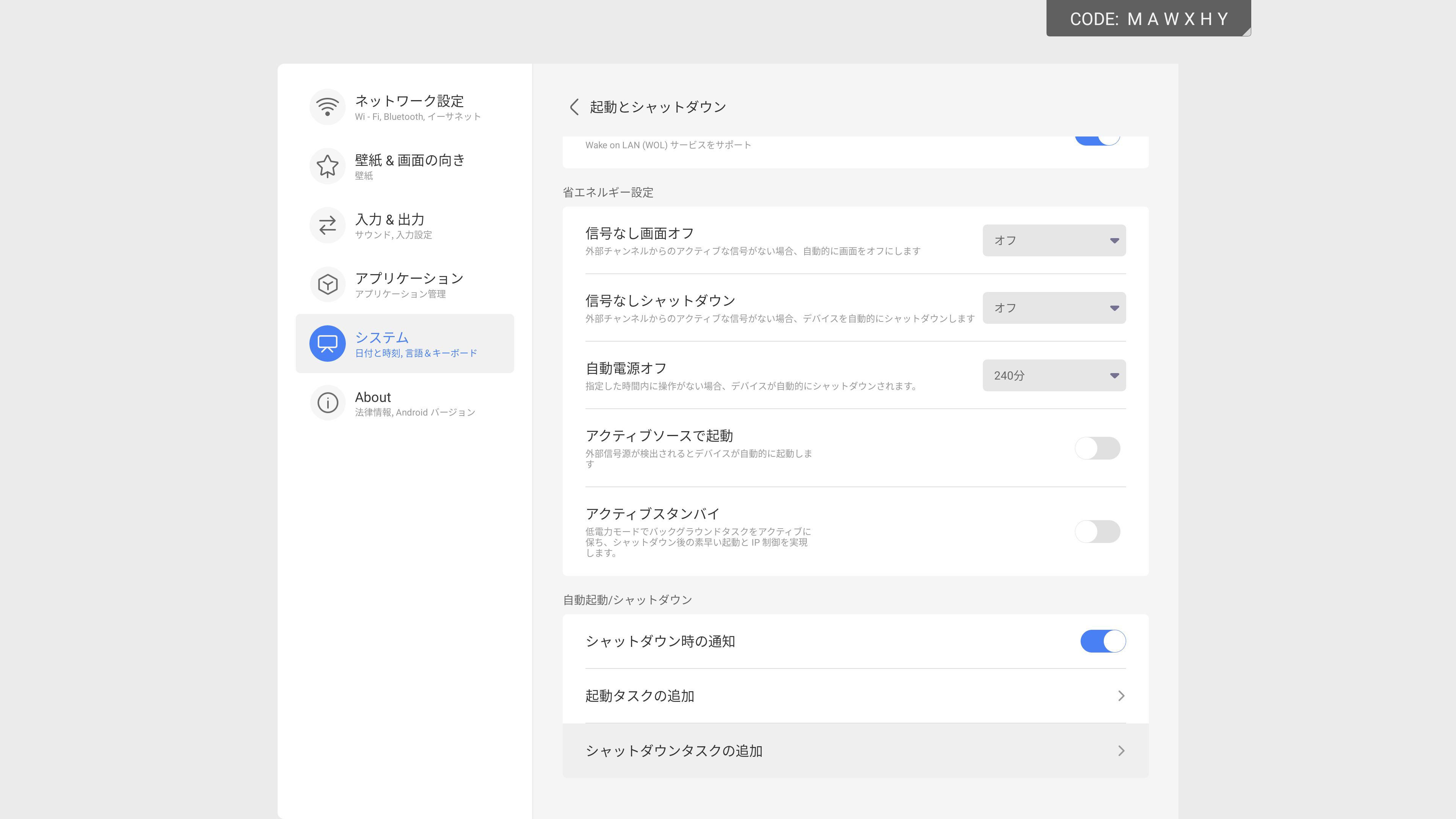 信号なしシャットダウン | 映像信号がなしの場合、シャットダウンする |