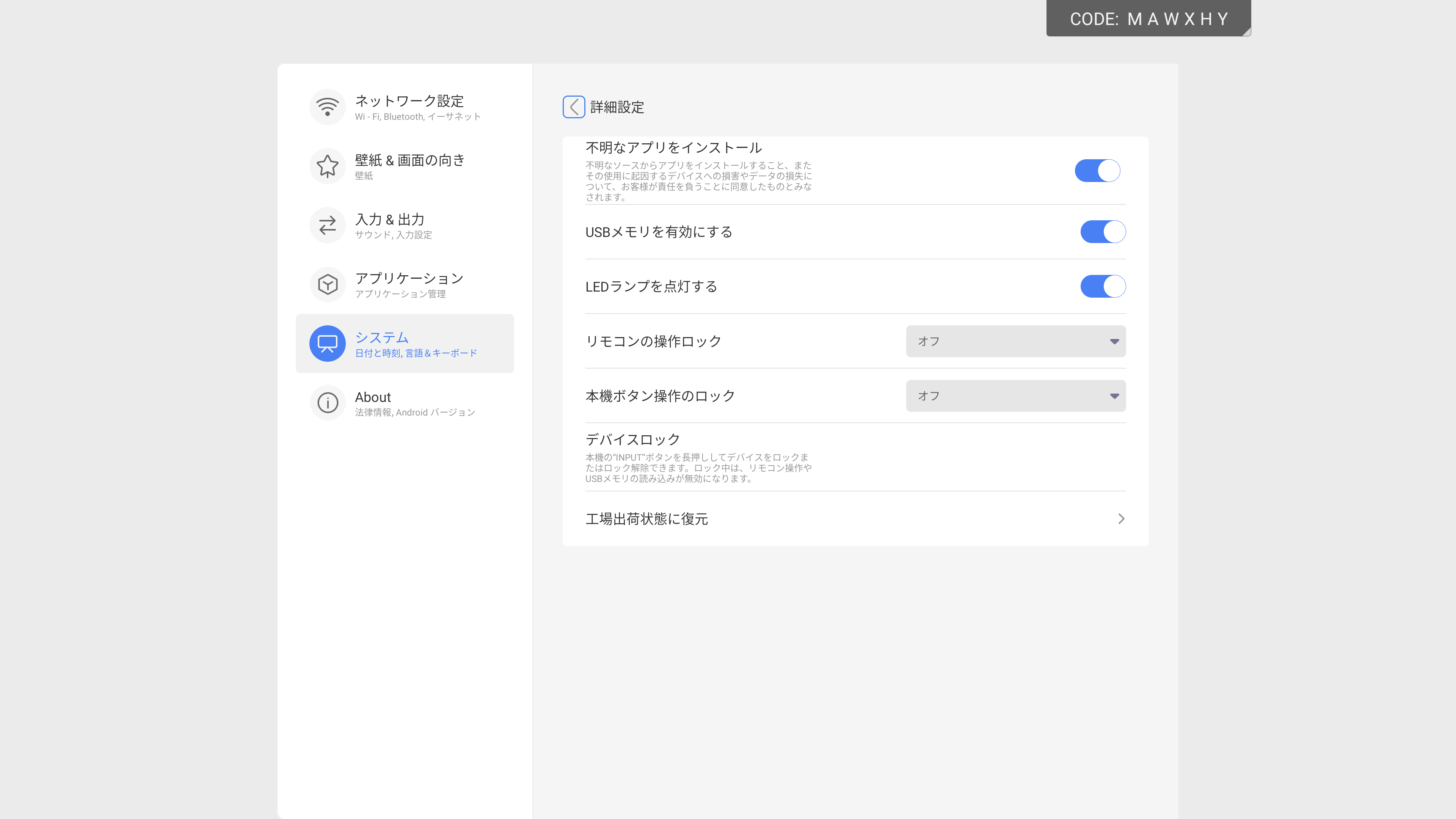 本機ボタンの操作ロック | 本機物理ボタンの使用を禁止する |