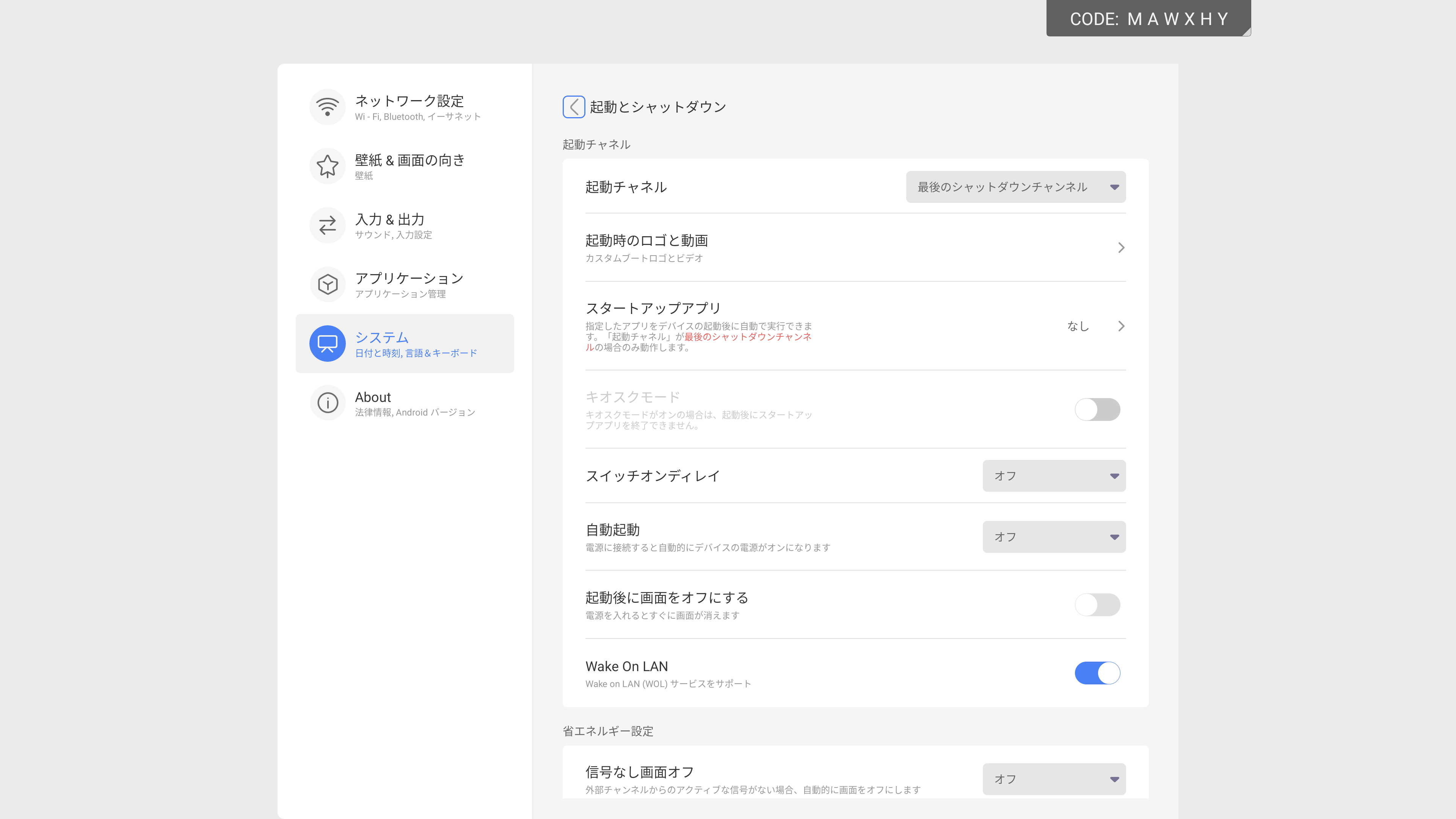 起動チャネル | 起動時に表示する映像チャネルを設定 |