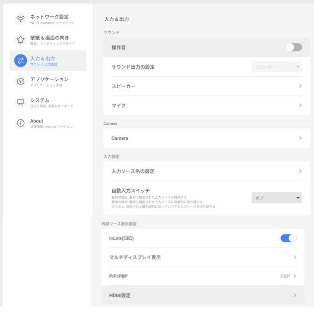 In Link (CEC) | 有効にすると、光デジタルオーディオで機器連携が可能 |