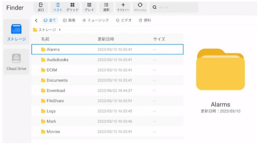 本体のストレージ、USB メモリ、クラウドのデータを表示します。 USB メモリやクラウドのデータを使ってプレイリストを作成できます。