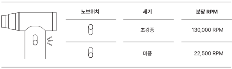 초강풍 모드로 10분 이상 연속 사용 시 발열이 될 수 있으며, 잦은 방전은 배터리 수명에 영향을 줄 수 있습니다.