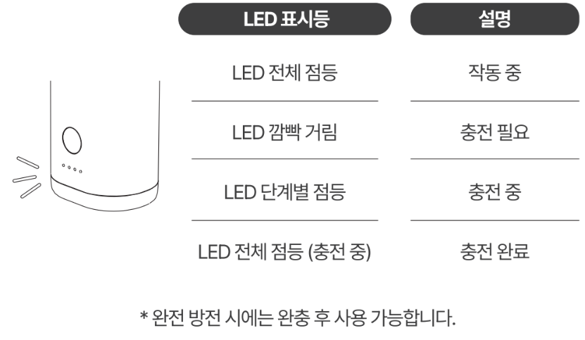 배터리 보호 및 수명, 성능 저하 방지를 위해 완전 방전 시에는 반드시 완충 후 작동됩니다.