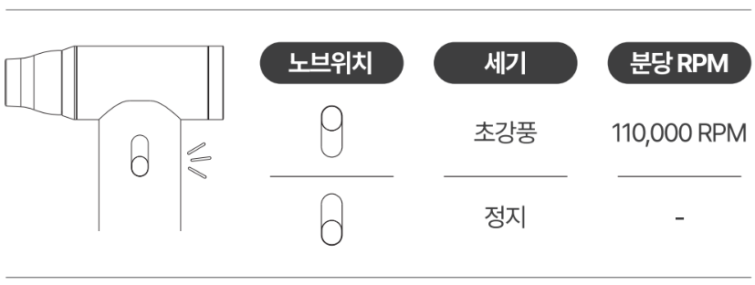 초강풍 모드로 10분 이상 연속 사용 시 발열이 될 수 있으며, 잦은 방전은 배터리 수명에 영향을 줄 수 있습니다.