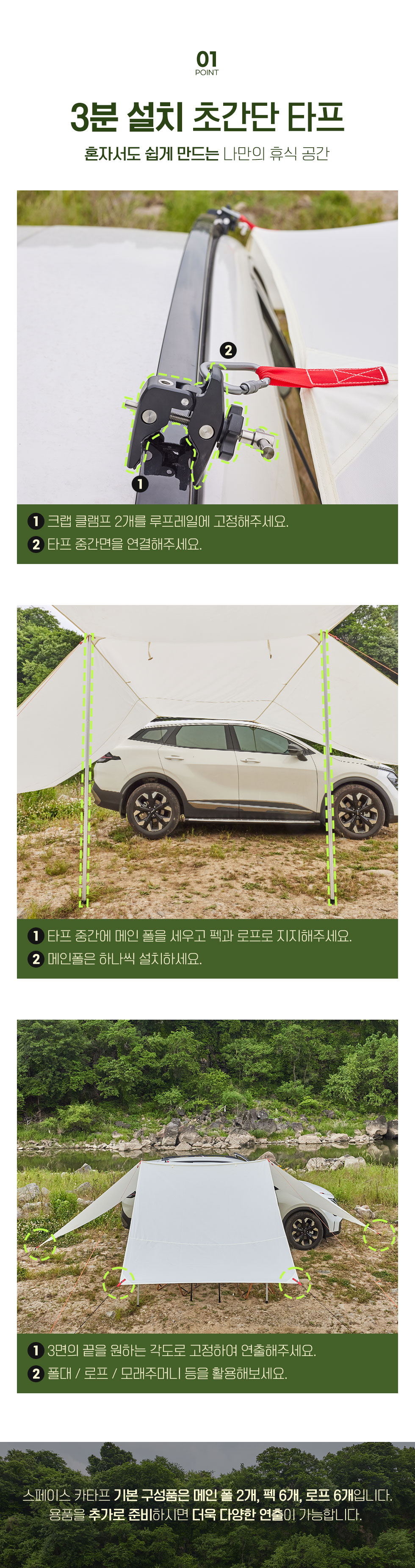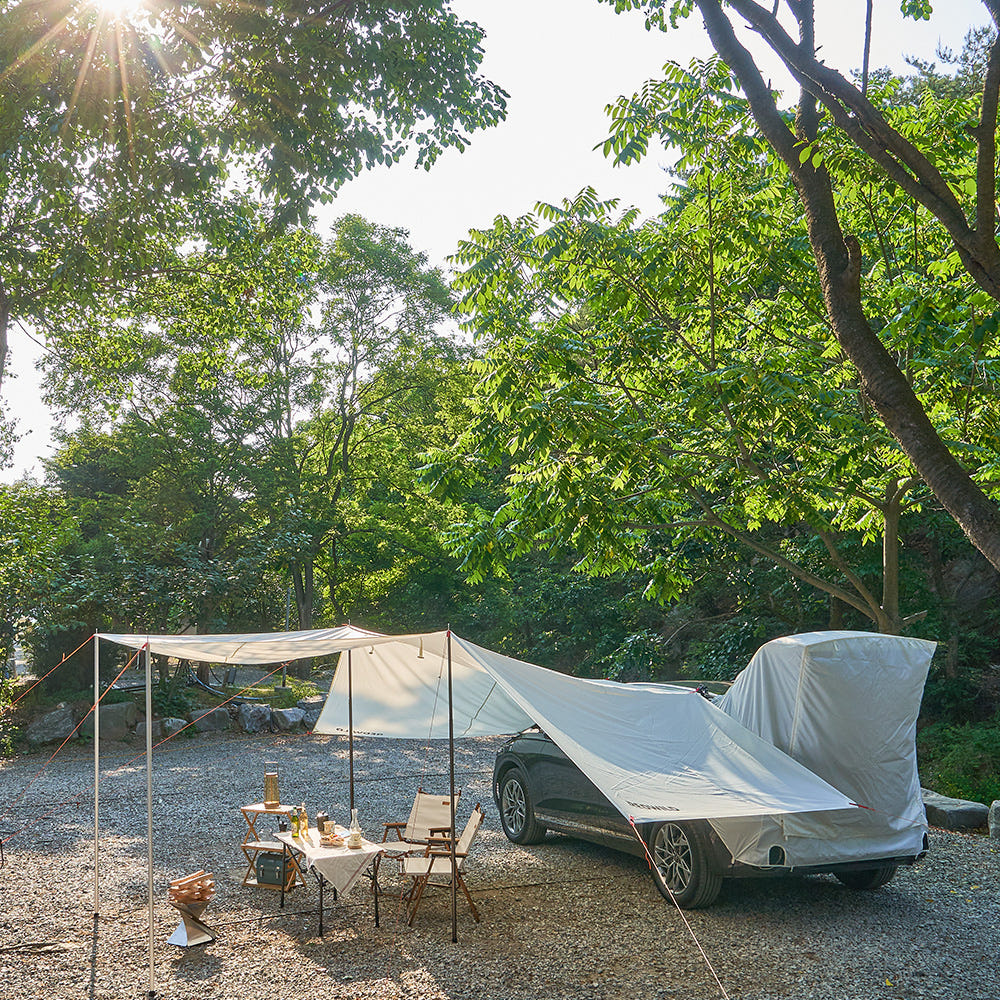 차량 측면이나 트렁크에 도킹하여 설치할 수 있어 차박, 오토캠핑, 피크닉 등 다양한 상황에서 활용할 수 있으며, 혼자서도 쉽게 설치 가능한 구조로 초보 캠퍼에게도 안성맞춤입니다.