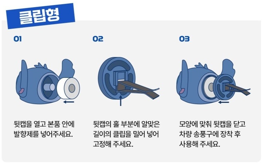 모양에 맞춰 뒷캡을 닫고 차량 송풍구에 장착 후 사용 해주세요.