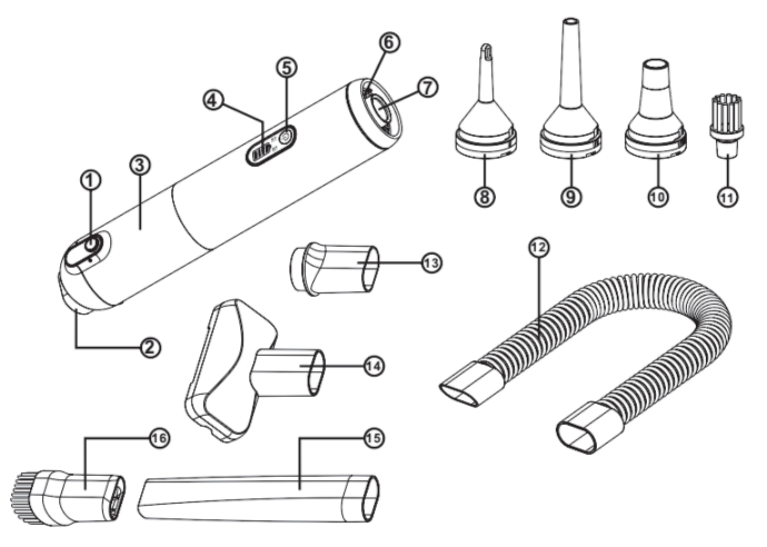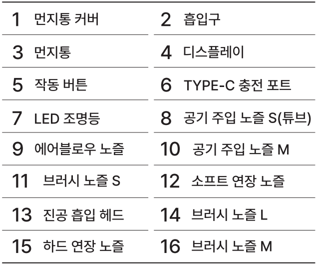 다양한 노즐 구성 : 브러시 노즐(카펫·시트 먼지 제거), 에어건 노즐(틈새·깊숙한 곳 바람 분사)
