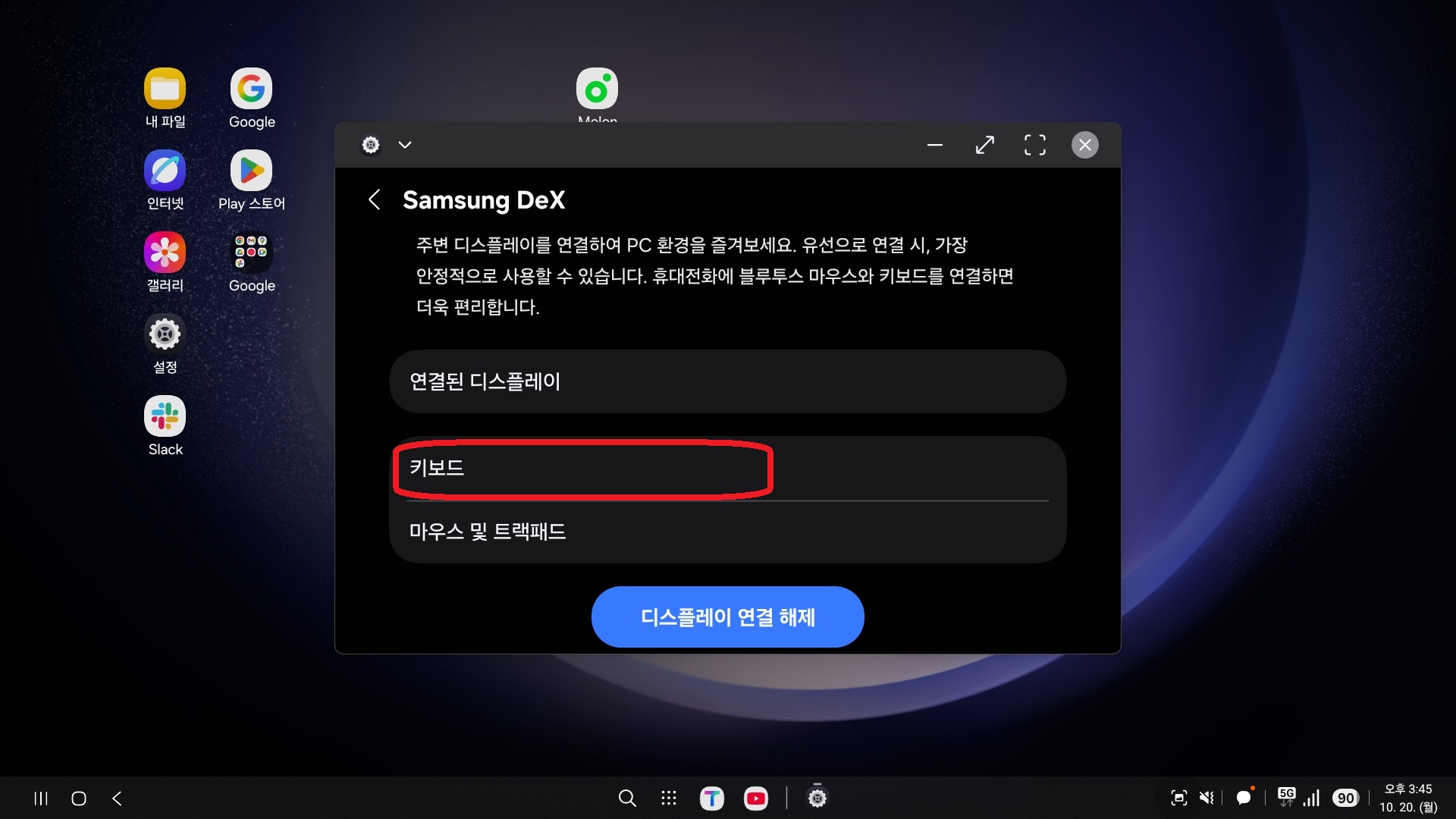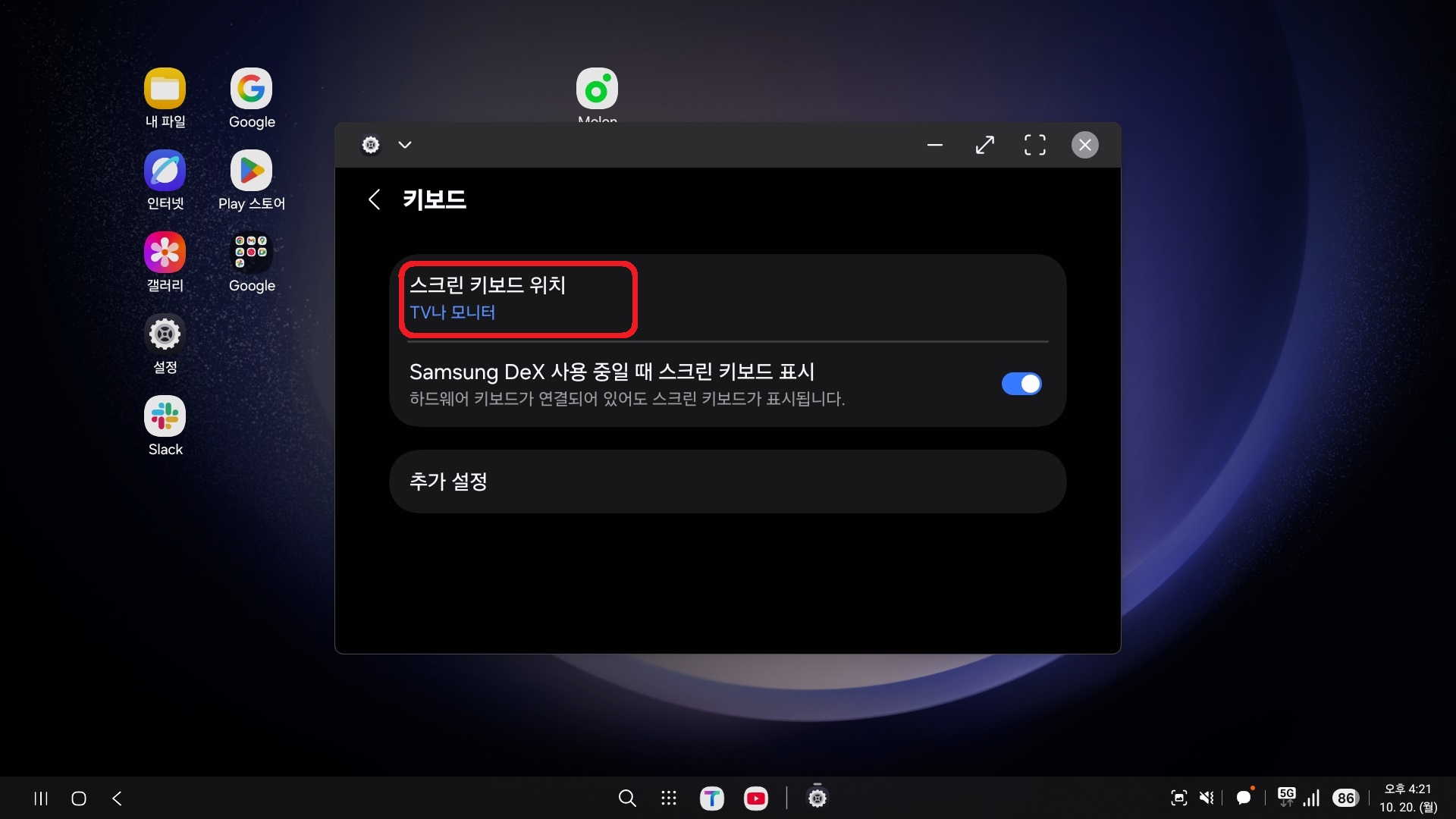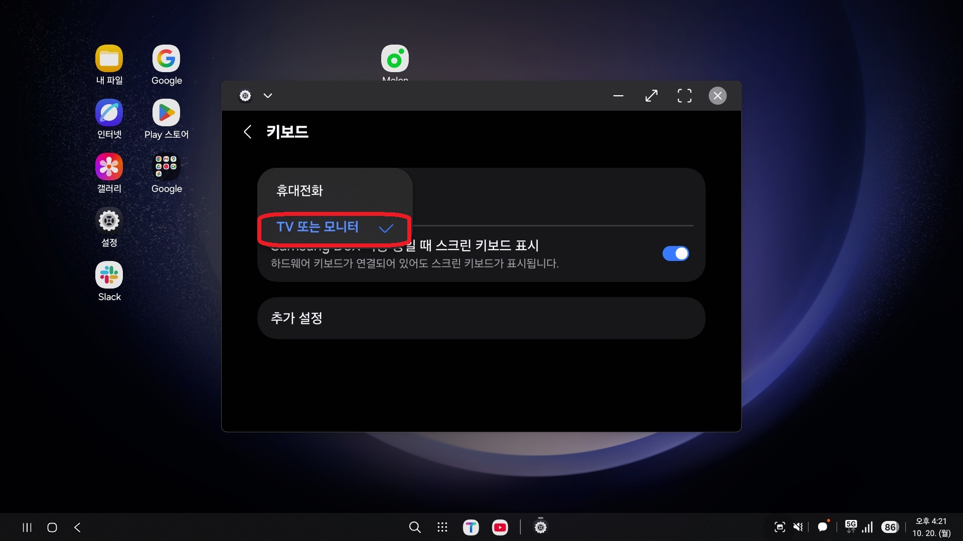 DeX는 입력창(검색창) 터치 시 화면에 키보드가 자동으로 표시되어 텍스트를 입력할 수 있습니다. 자동으로 키보드가 표시되지 않는다면, 아래의 방법을 사용해 주세요.