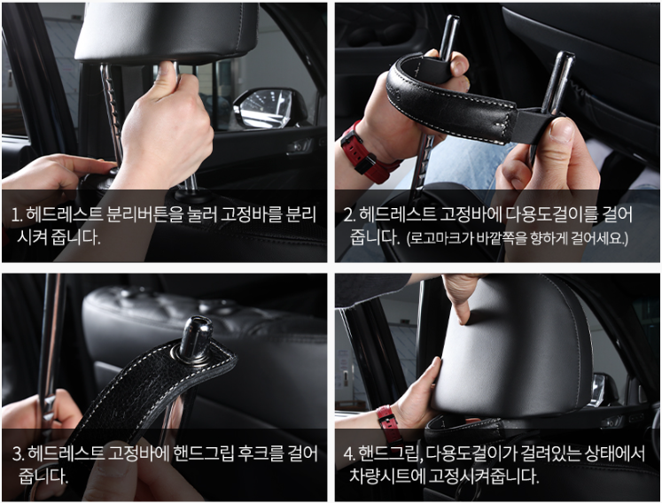 헤드레스트 고정바에 핸드그립 후크를 걸어줍니다.