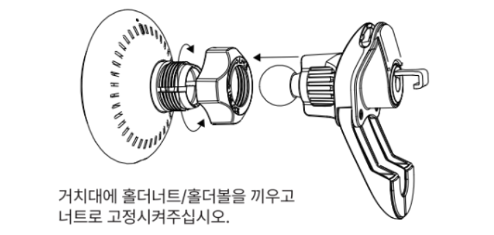 거치대에 홀더너트/홀더볼을 끼우고 너트로 고정시켜주시기 바랍니다.