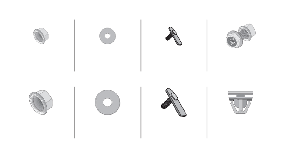 M10 너트 8개 (14mm 소켓용)│M10 평와셔 8개│M10 T자형 볼트 8개│로커 패널 고정핀 22개