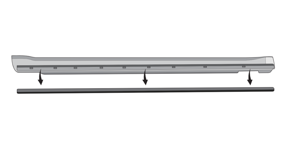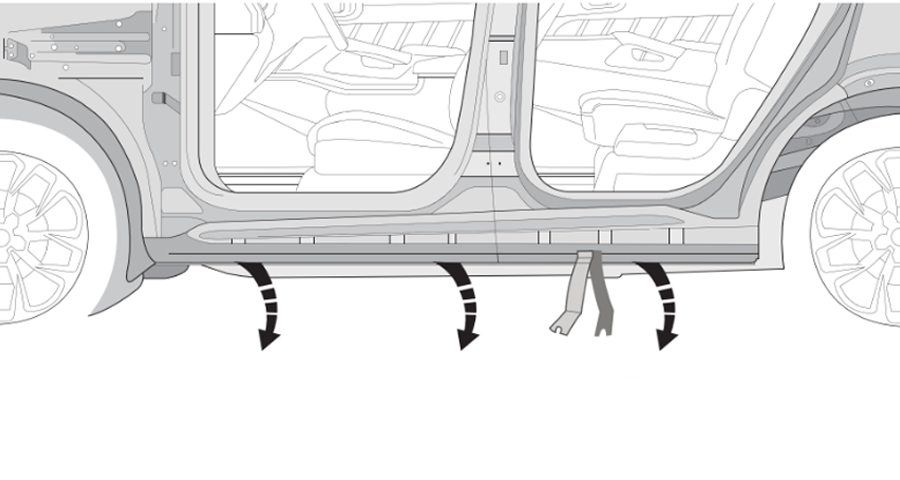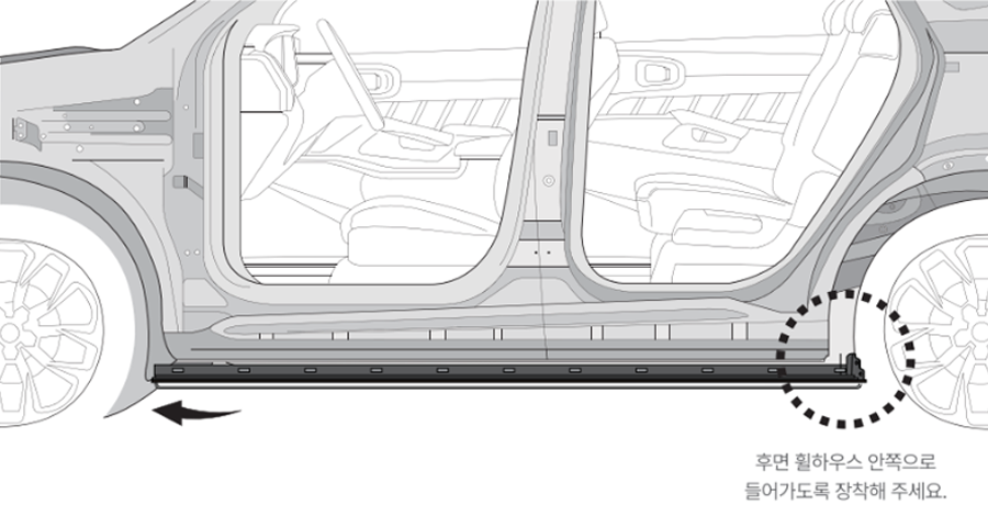 순정 사이드 씰을 분리한 구멍에 로커 패널 고정핀이 정확히 결합되도록 위치를 맞춘 후, 프론트부터 밀어 넣어 차량과 결합해 주시기 바랍니다.
