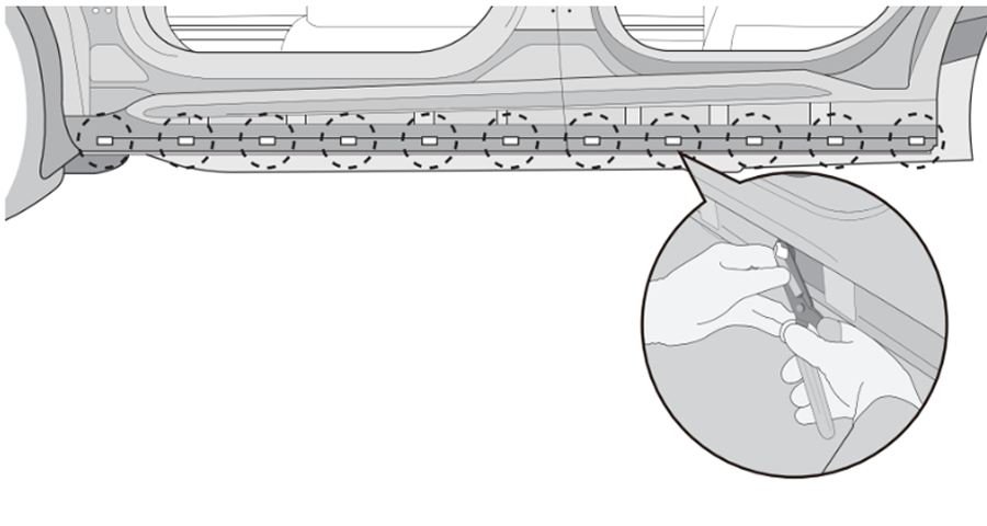 롱노우즈나 송곳 등 적절한 도구로 안쪽 고정핀을 밀어 주시면, 사이드 씰에 연결된 고무 몰딩을 분리할 수 있습니다. 이때 고무 몰딩이 손상되지 않도록 천천히 진행해 주시기 바랍니다.