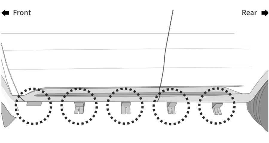 사이드스텝 양쪽에는 각각 11개의 고정핀이 장착되며, 모든 핀이 올바른 위치에 맞춰졌는지 끝까지 확인해 주시면 안정적으로 설치할 수 있습니다.