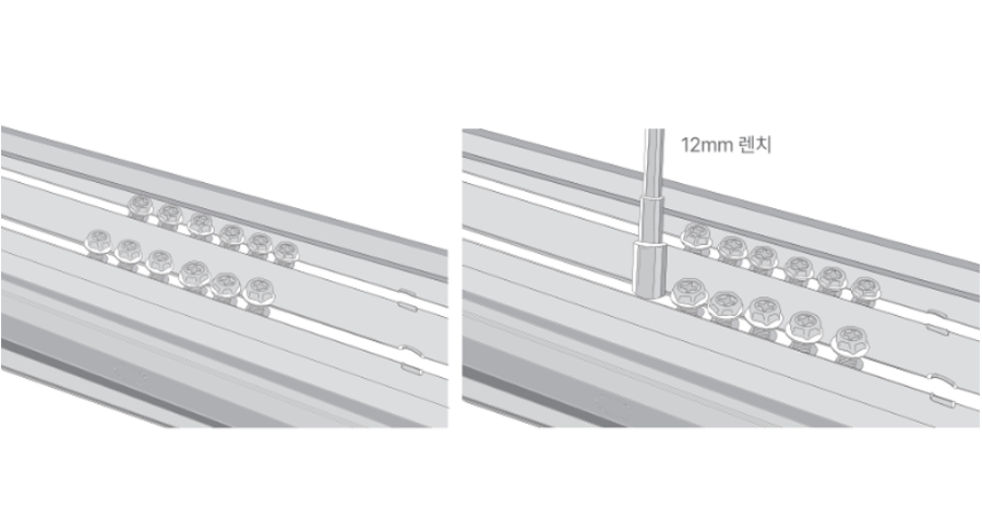 브라켓과 볼트의 체결 순서가 바뀌면 틀어짐이 생길 수 있습니다. 반드시 M10 T자형 볼트와 M6 T자형 볼트를 모두 체결한 뒤, 레일 부분의 볼트와 너트를 체결해 주시기 바랍니다.