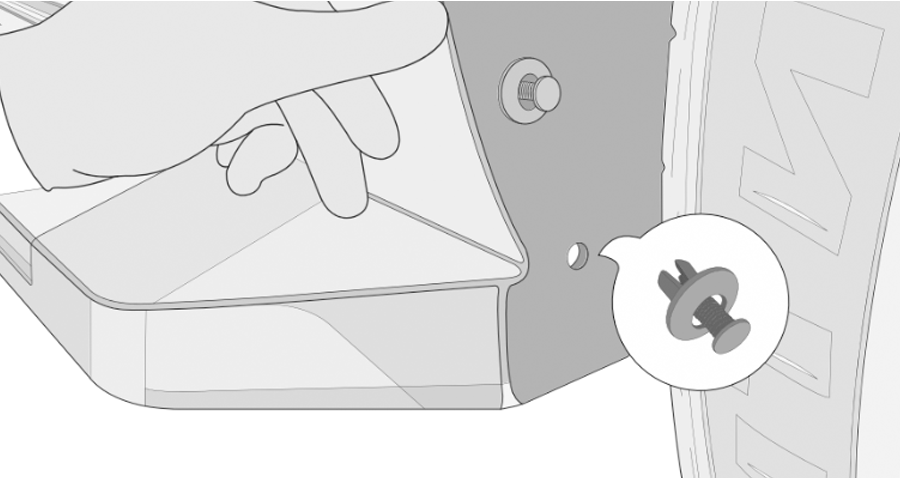 후면부 휠 하우스 홀에 장착된 순정 나사 2개와 하단 순정 핀 1개를 탈거한 후 머드가드를 장착해 주시기 바랍니다.