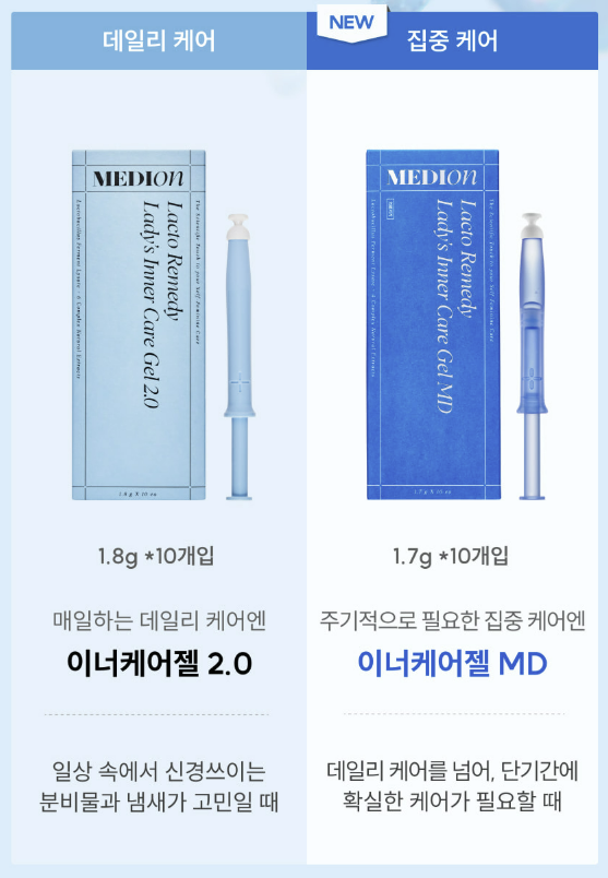 이너케어젤 2.0과 이너케어젤 MD는 Y존의 노폐물과 잔혈 등을 배출해내어 Y존을 깨끗하게 유지하여 질염이나 기타 질환을 예방하는 원리로 사용방법은 다르지만, 기본적인 원리는 동일합니다.